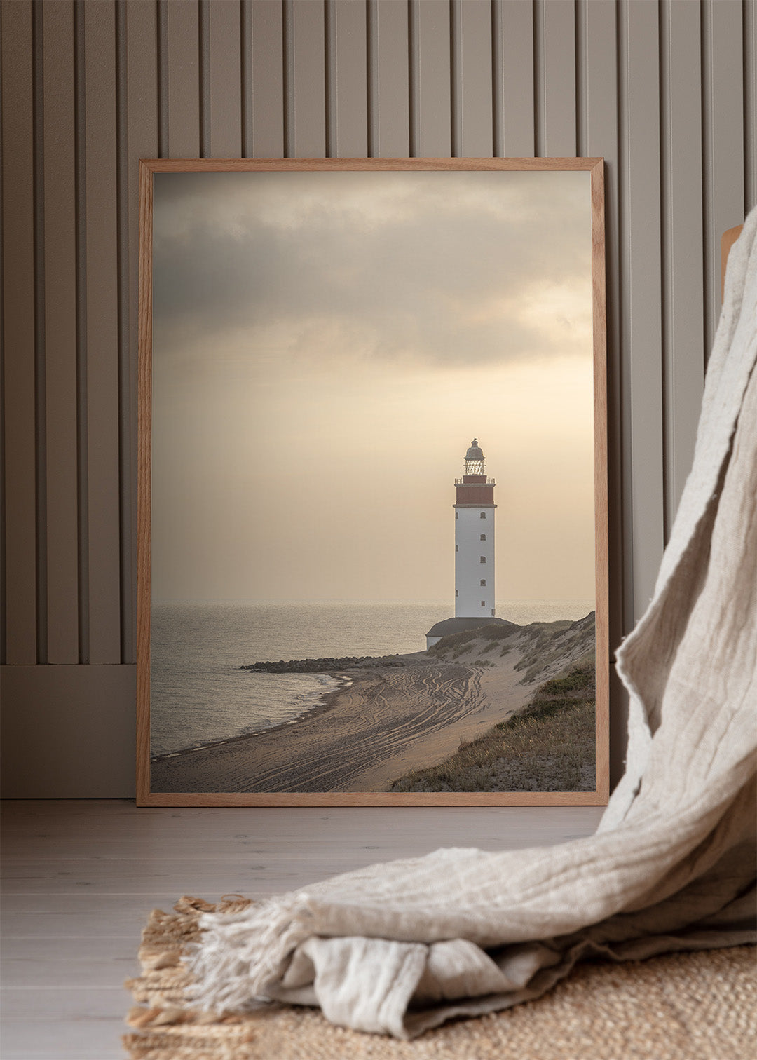 Anholt fyr rejser sig markant i Kattegat og er et af Danmarks vigtigste fyrtårne. Motivet indfanger fyrets rolle som pejlemærke og symbol på sikkerhed og navigation.
