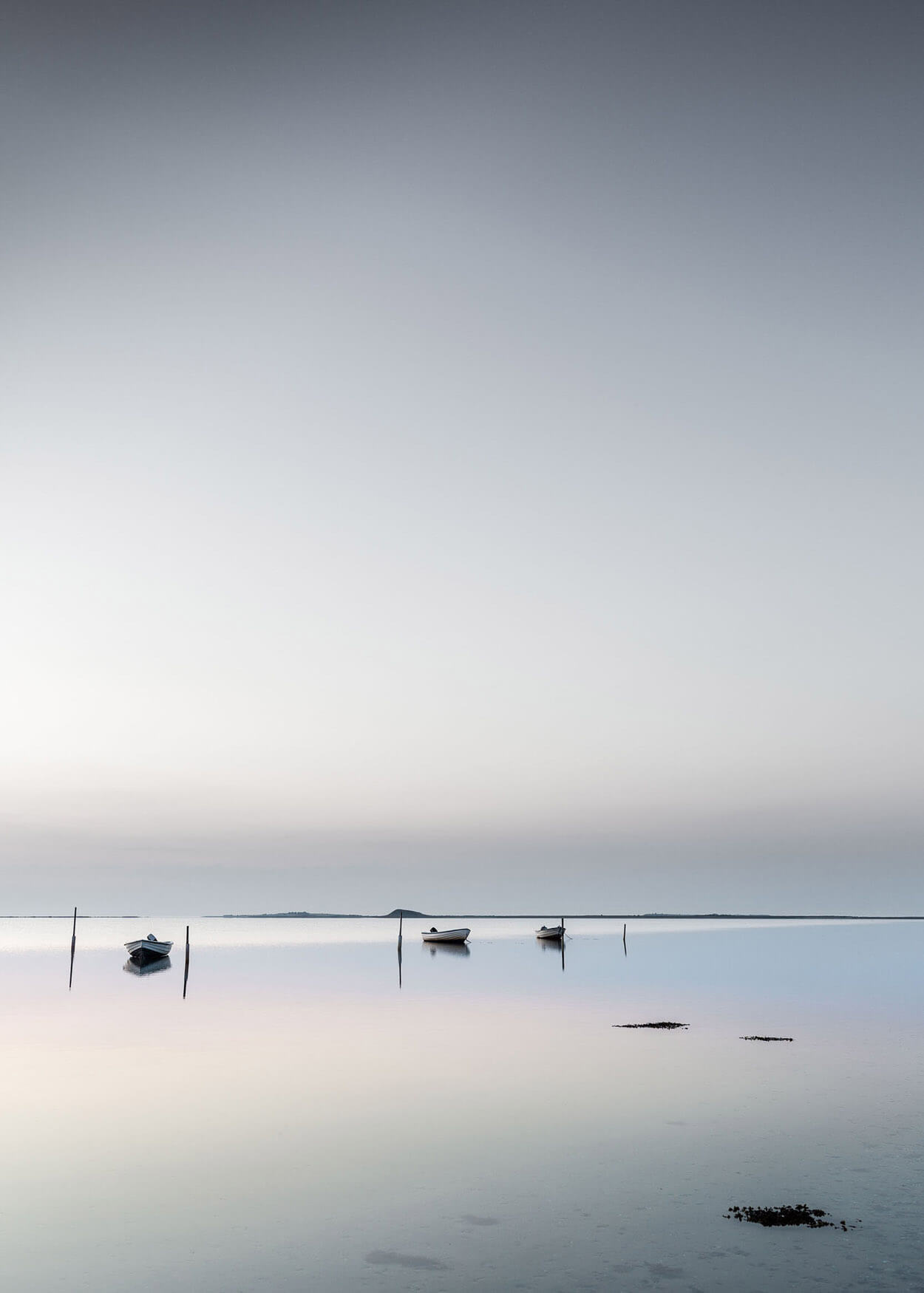 Både plakat fra Stavns Fjord på Samsø. Fotografiet er taget på en stille sommeraften, hvor de små joller tegner sig mod horisonten på det blikstille vand. Den beskyttede fjord er kendt for sin rige natur og et fantastisk sted at fiske eller observere fuglelivet. Stedet indbyder også til lange gåture langs Besser Rev, hvor man kan opleve fjordens fredfyldte skønhed.