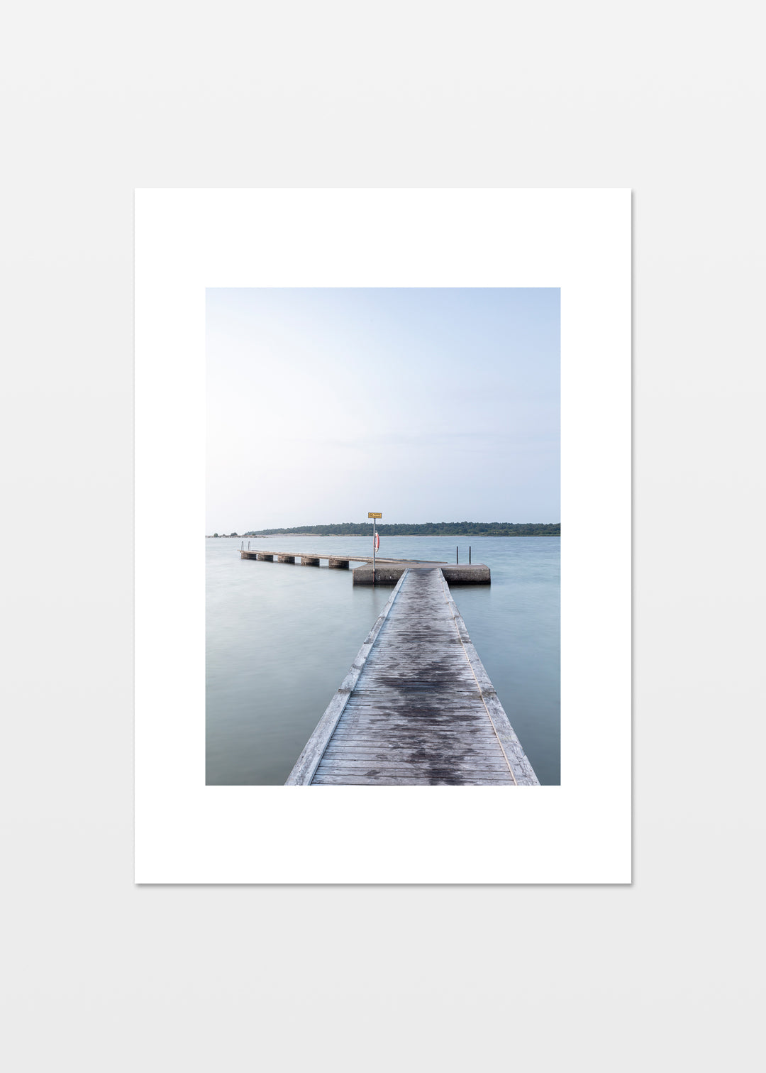 Badebroen i Katthammarsvik på Gotland er fanget i bløde blå nuancer, der indrammer den rolige sommerstemning ved havet. Den enkle komposition med broen, der fører ud i det stille vand, giver et minimalistisk og afbalanceret udtryk.