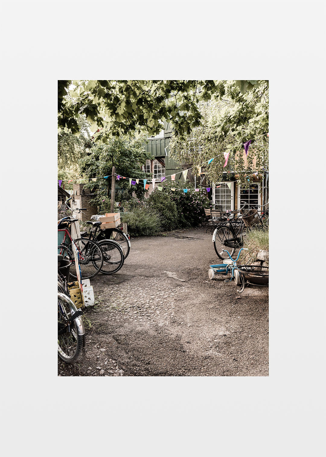 Baggård plakat af en hyggelig baggård med cykler. Inde på Christiania snor små veje og stier sig gennem et virvar af grønt, og her kan man finde små lommer af noget utæmmet og organisk midt i byen. I denne baggård skaber de grønne træer en rolig oase, hvor man kan holde en pause fra busser, biler og travle cykler og mærke følelsen af at være i det fri. Træerne skærmer mod støj og bringer en følelse af nærvær og stilhed til det lille hjørne af byen. Plakaten indfanger den unikke stemning fra et sted, hvor naturen møder kulturen og skaber et frirum midt i København.