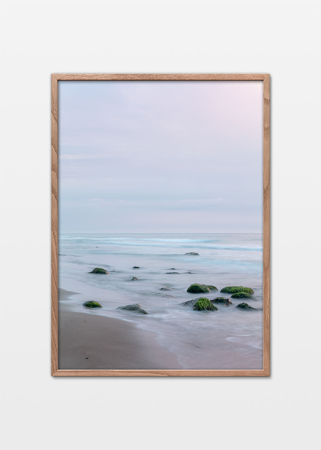 Vores blå time plakat viser den rolige atmosfære på stranden efter solen er gået ned ved Lønstrup Strand. Dette enkle, men dybt stemningsfulde fotografi fanger øjeblikket med enkelte sten dækket af grønne alger, der bryder vandet.