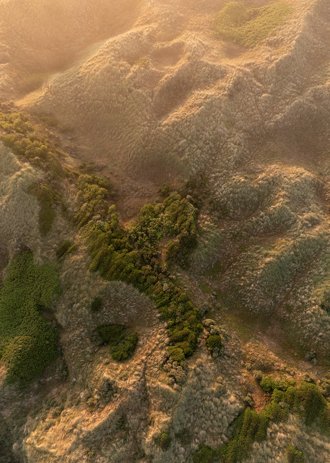 Blokhus klitlandskab plakat præsenterer et fascinerende fugleperspektiv over klitterne ved Blokhus. Fotografiet indfanger de bølgende former og de grønne nuancer, mens solopgangens varme lys skaber en smuk balance mellem lys og skygge. Det harmoniske samspil mellem naturens detaljer og morgenlysets farver giver en følelse af ro og naturlig skønhed.