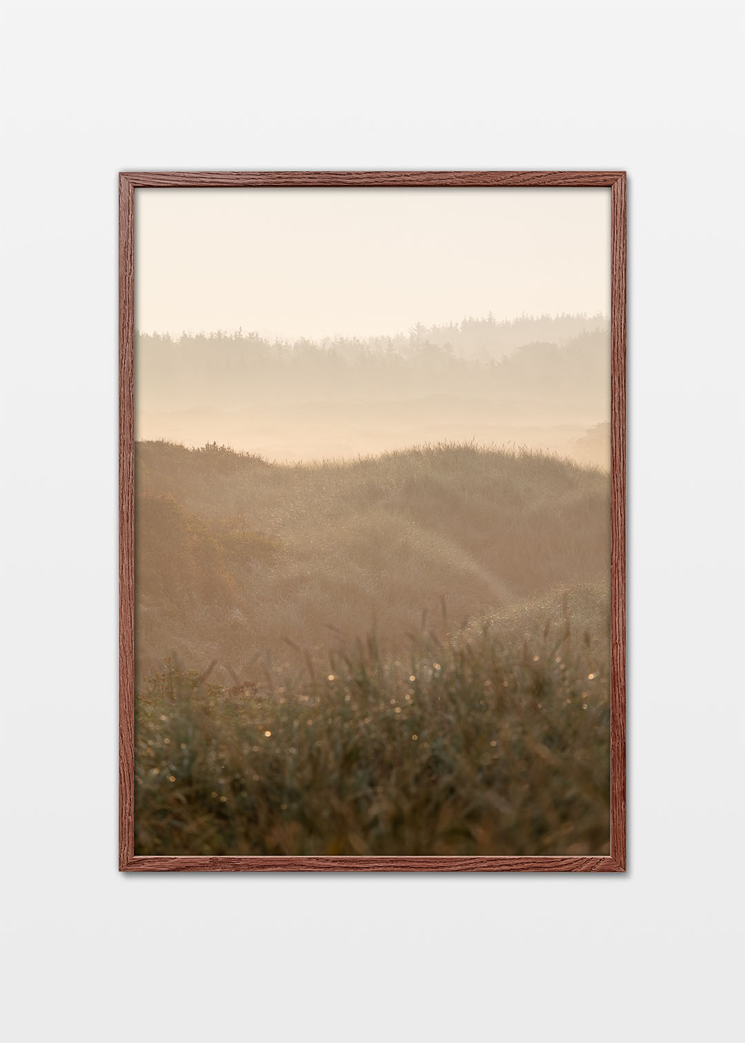 Blokhus klitplantage plakat viser den rolige skønhed i klitlandskabet ved Blokhus. Morgentågens lette slør lægger sig over klitterne, mens solens første stråler skaber en varm, gylden stemning. De bløde græsbeklædte former og baggrunden med de mørke træer tilføjer dybde og harmoni til motivet.