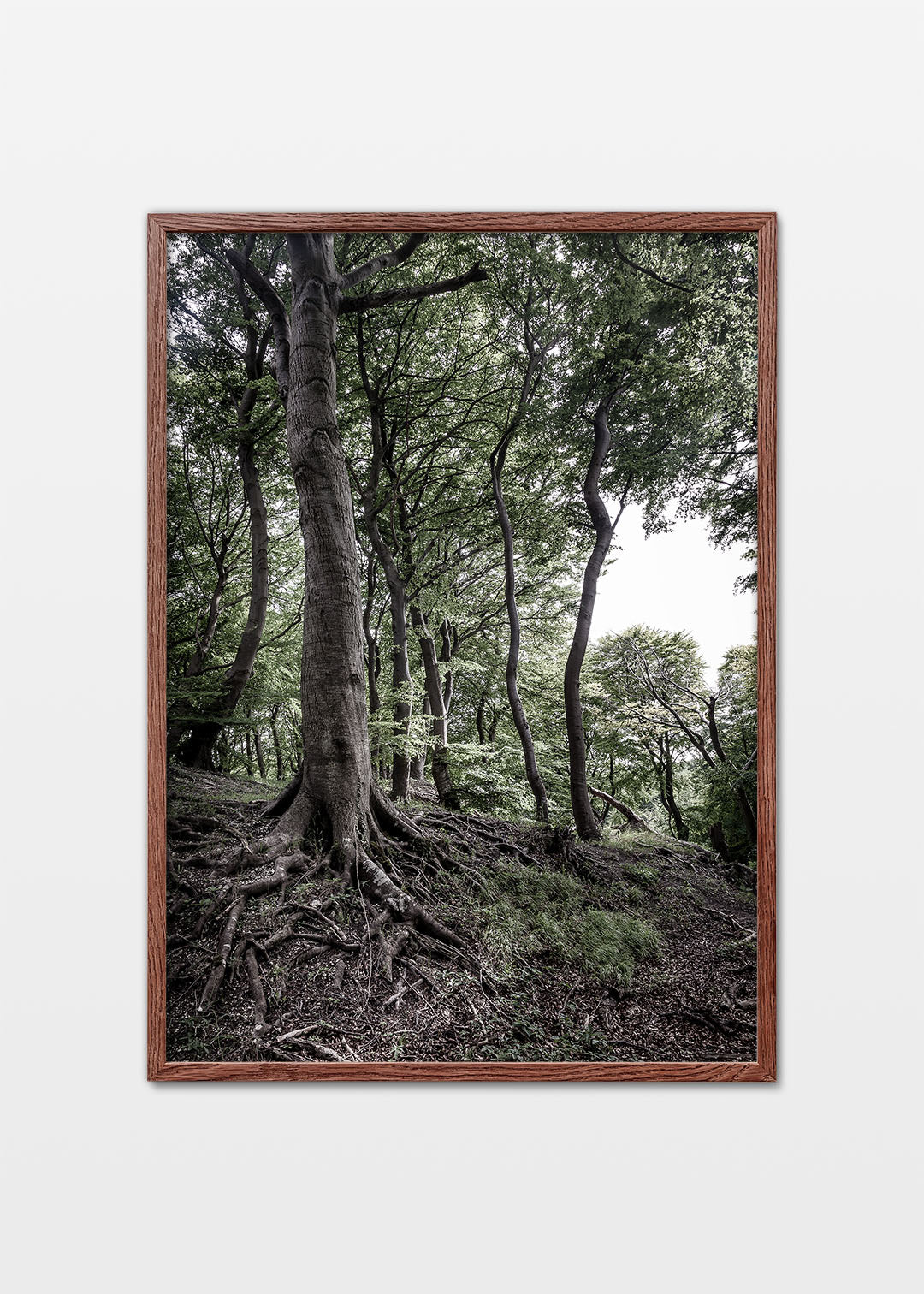 Bøgetræ plakat fra området ved Møns Klint. Fotografiet er taget i en gammel bøgeskov, hvor rødderne slynger sig dramatisk i den mørke skovbund og skaber en stemning, der minder om scenen fra et dystert eventyr. Her har motorsave ikke lydt i mange år, og skoven har fået lov til at udvikle sig frit, hvilket giver den en helt særlig karakter som naturskov. Vi elsker, når naturen får lov til at passe sig selv og skabe et landskab fyldt med liv og skønhed. De frodige grønne farver i vores bøgetræ plakat skaber ro og bidrager til en afslappende stemning, mens de mange detaljer gør motivet spændende og dragende.