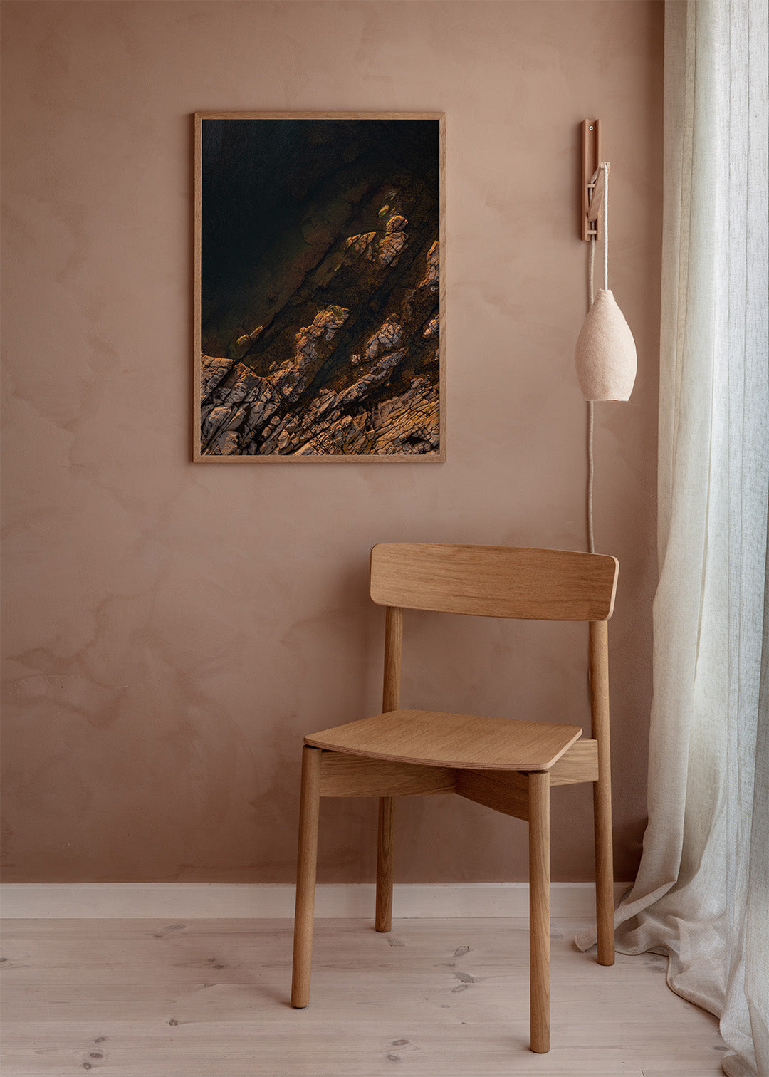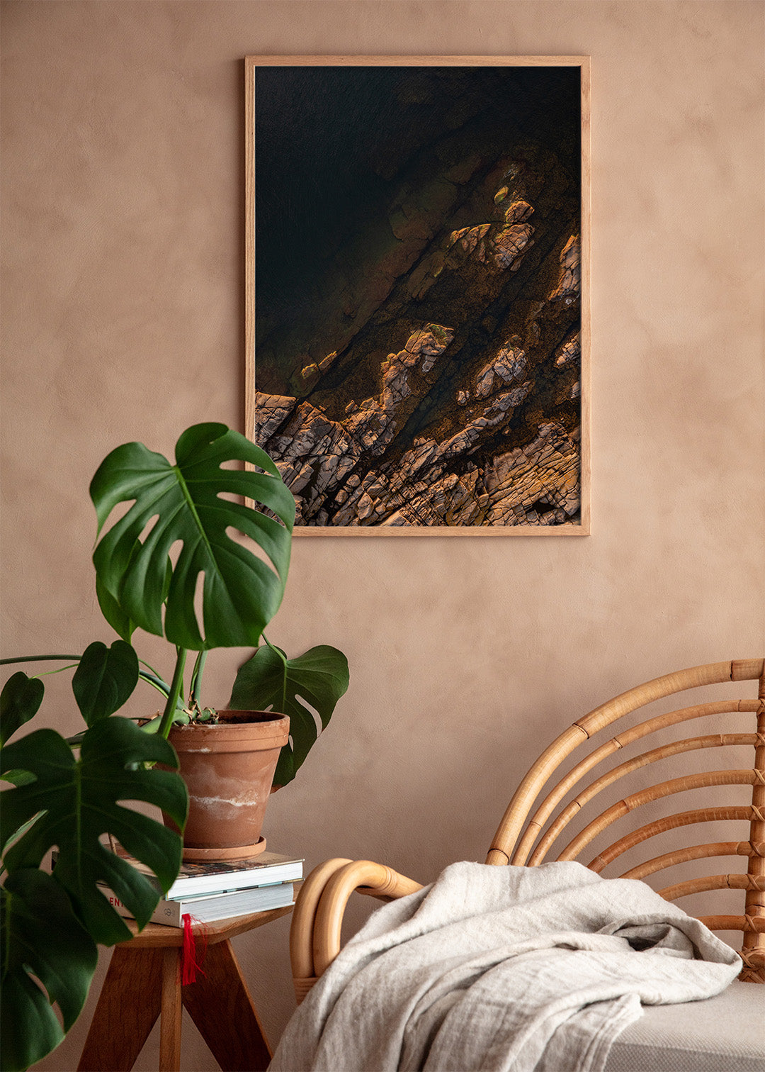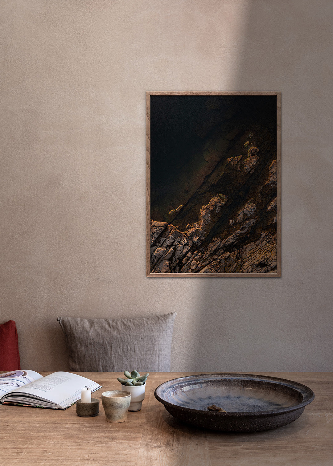 Bornholm Kyst 2 præsenterer et fantastisk dronefotografi af Bornholms klipper. Dette unikke motiv indfanger de smukke detaljer og farver i landskabet, hvilket gør det til en perfekt plakat for dem, der ønsker at bringe naturens ro ind i deres hjem.