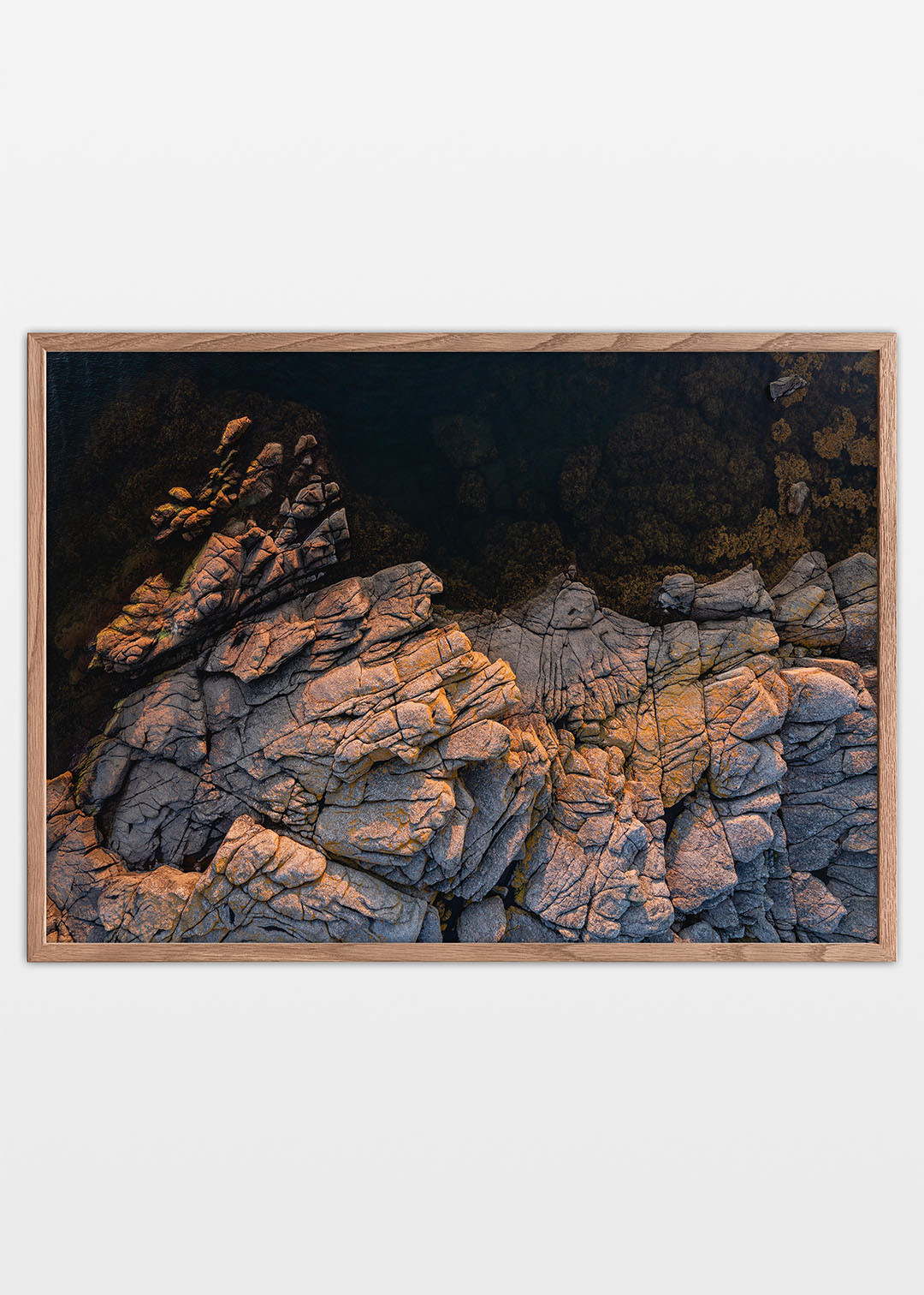 Bornholm Kyst 4 plakat viser et detaljeret dronebillede af Bornholms klipper. Dette unikke motiv indfanger landskabets skønhed og styrke, hvilket gør det ideelt for dem, der ønsker at føle sig tættere på naturen og bringe ro ind i deres hjem.