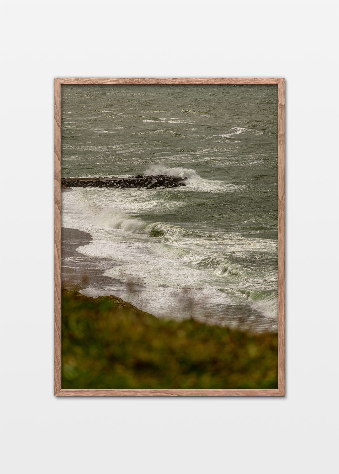 Det enkle fotografi vi har brugt til plakaten viser hvordan høfden beskytter kysten mod de store dønninger. De smukke grønne bølger ruller ned langs kysten og høfden beskytter stranden. Det er en smuk oplevelse at følge stien ved Bovbjerg - udsigten er simpelthen fantastik.