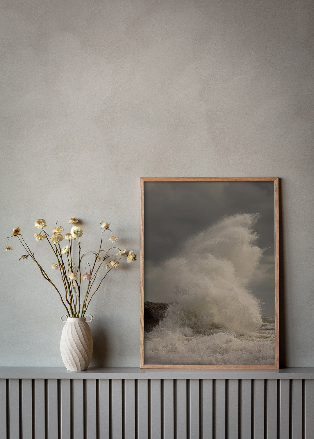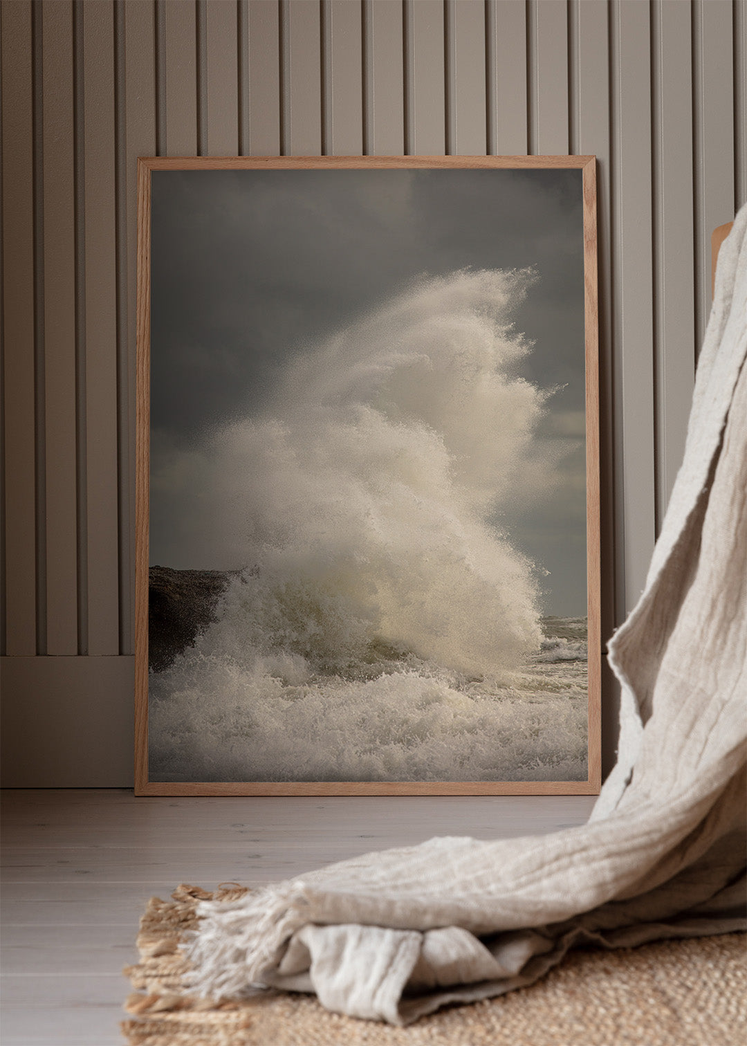 Plakaten gør sig godt i stor-format i stuen eller ethvert rum, hvor du ønsker at tilføje noget dynamik og energi til indretningen. Fotografiet er taget lige i det øjeblik, hvor lyset bryder gennem skyerne og rammer bølgen, hvilket fremhæver de mange detaljer i vandet og giver et imponerende fokus på det sprøjtende havvand.