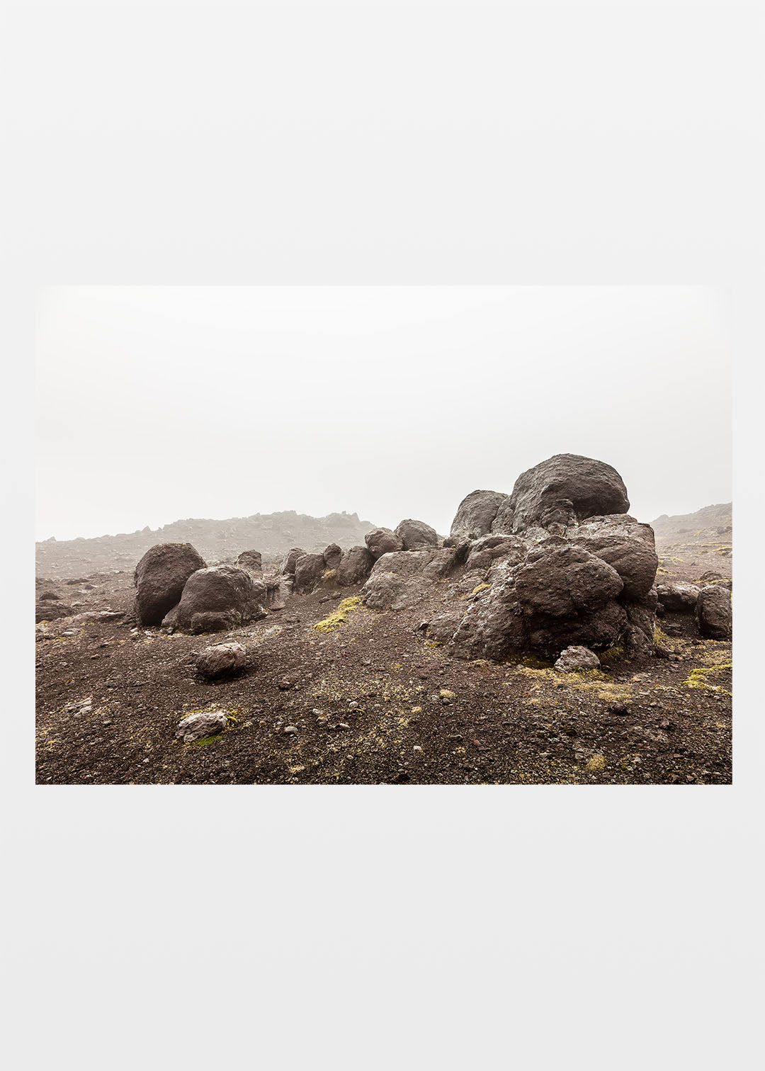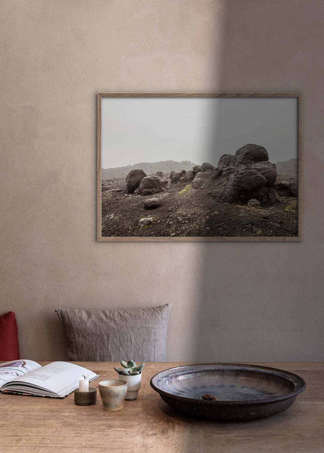 Fjeld plakat med fotografi fra Færøerne. Helt alene på toppen af fjeldet en tåget dag kan man føle sig som det eneste menneske på jorden. Klimaet er barskt, og uden retning kan man let fare vild og vandre rundt i timevis uden at møde en sjæl. Fotografiet indfanger den enkle og rå natur, hvor det gule mos breder sig over fjeldets flader, og vinden former og flytter små og store sten. Landskabet er både storslået og øde, hvilket gør det til en stærk kontrast til mere befolkede steder. Dette motiv passer perfekt ind i en enkel indretning med naturlige farver og skaber en følelse af ro og dybde.