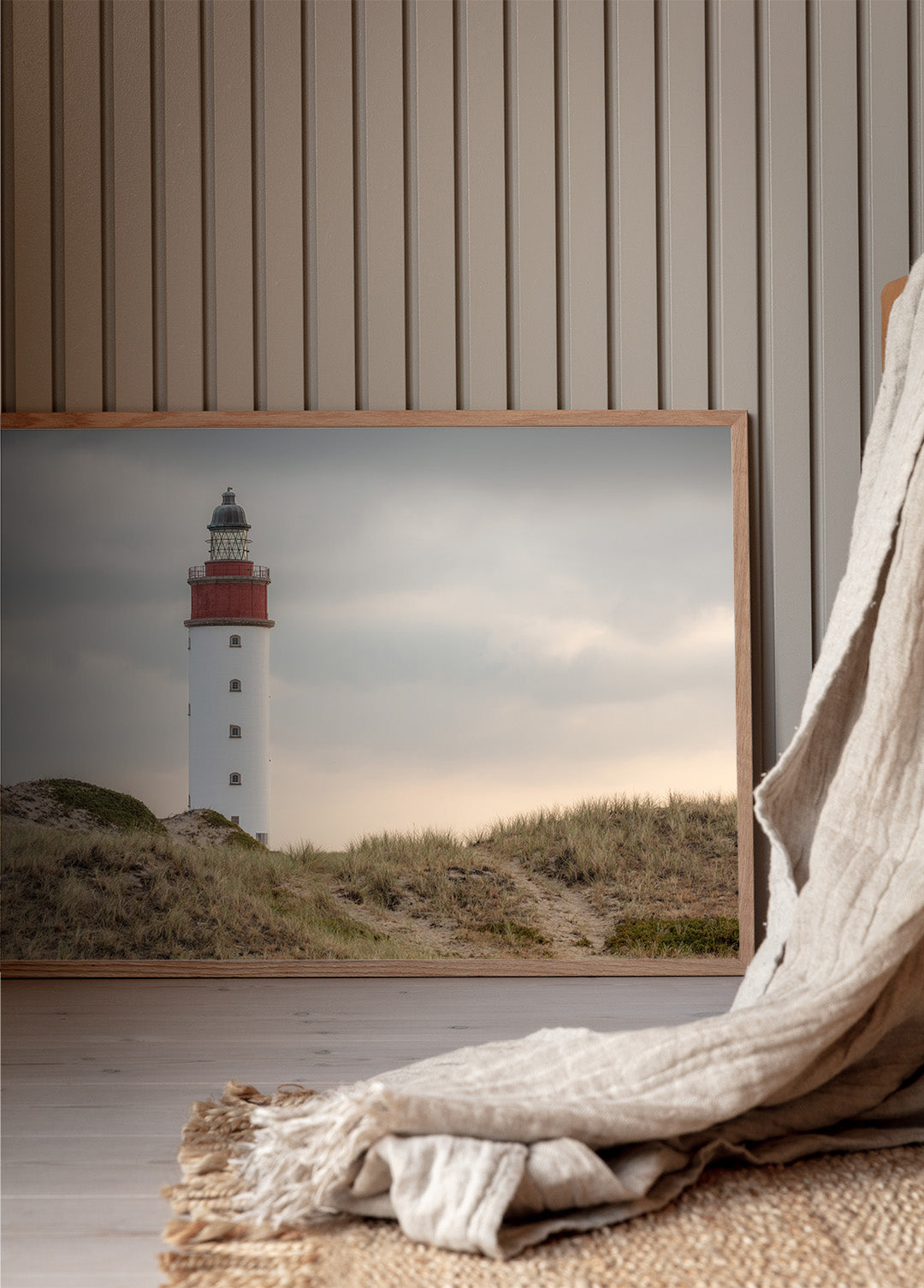 Plakat med Anholt fyr, et ikonisk pejlemærke midt i Kattegat. Det høje hvide fyr rejser sig markant over sandet og havet, og skaber en stærk kontrast til de åbne landskaber omkring det.