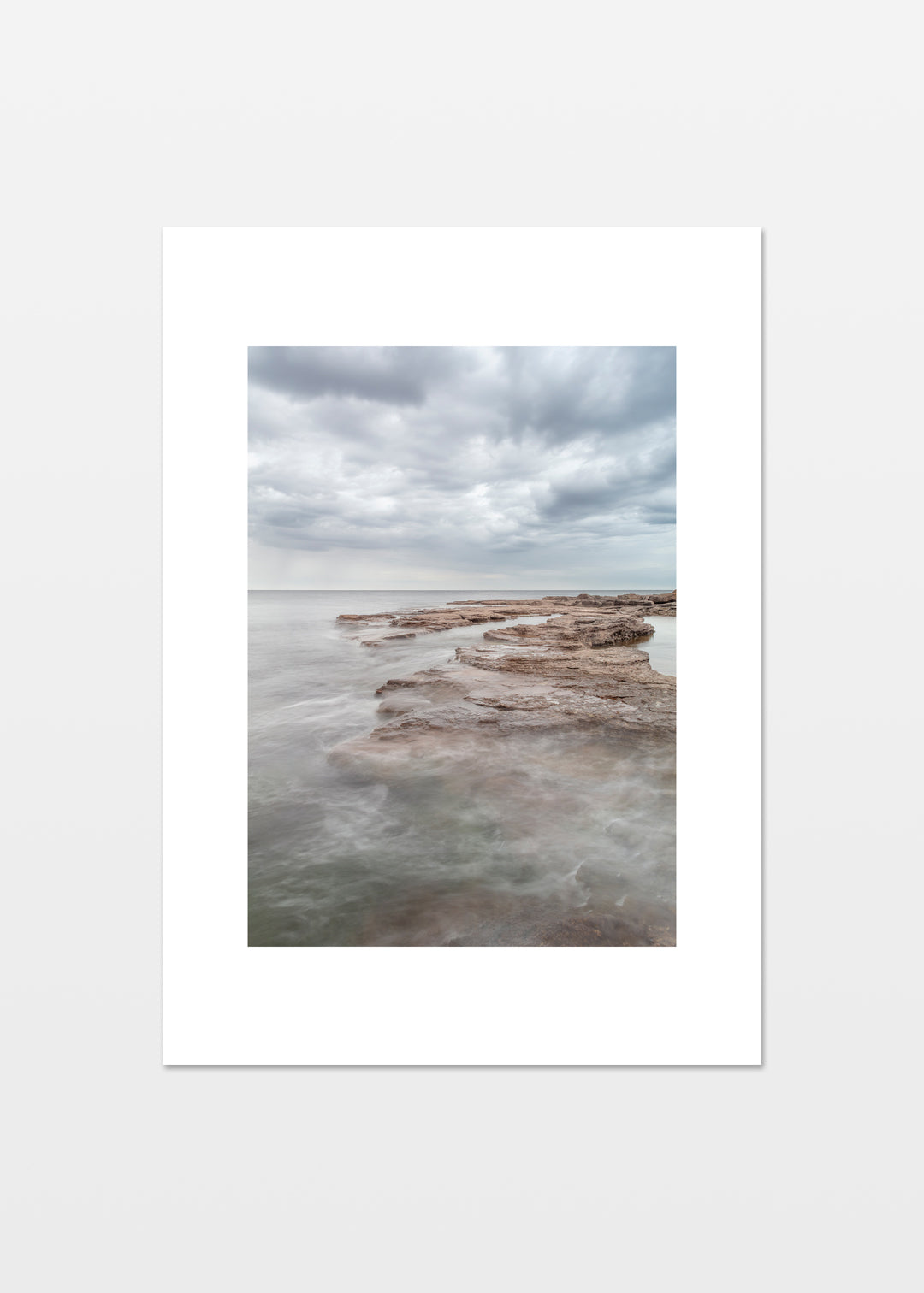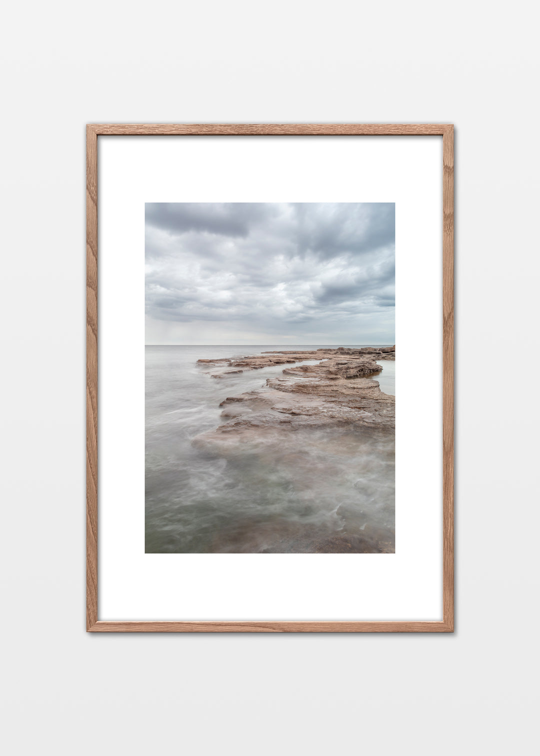 Fotografiet viser Gotlands karakteristiske flade klipper, badet i blødt lys under en skyet himmel. De lyse nuancer og det rolige hav skaber en stemning af ro og tidløshed, der inviterer til fordybelse.