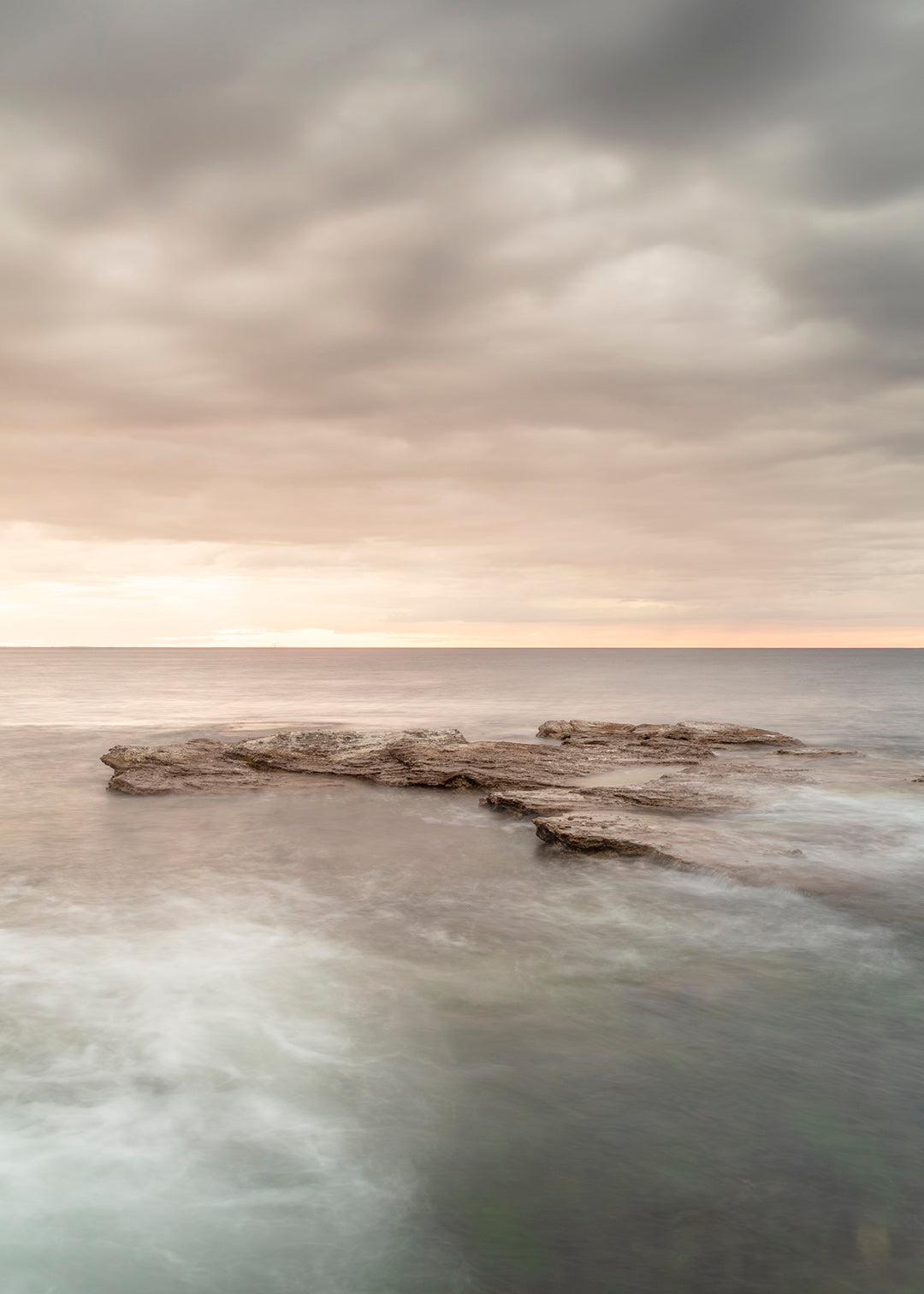 Dette lodrette motiv fra Gotlands klippekyst viser solens sidste lys over havet, hvor de lave klipper danner forgrund og leder blikket mod horisonten. Skyernes struktur og de bløde vandbevægelser giver billedet en rolig, meditativ stemning.
