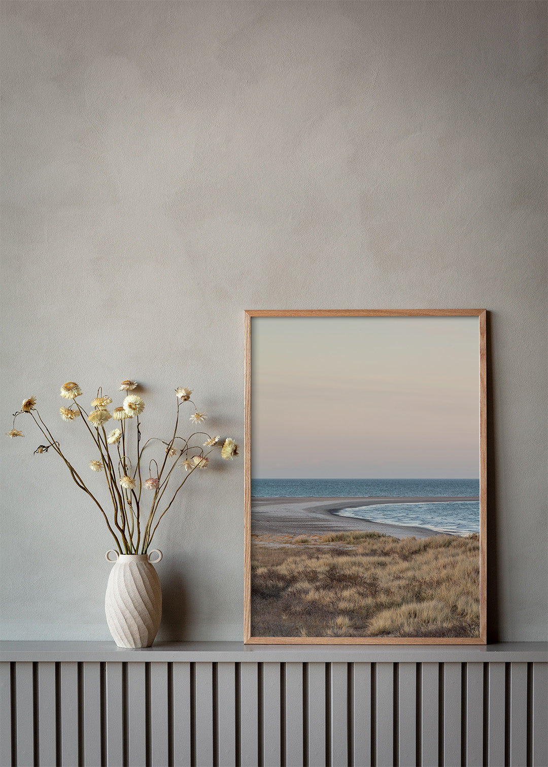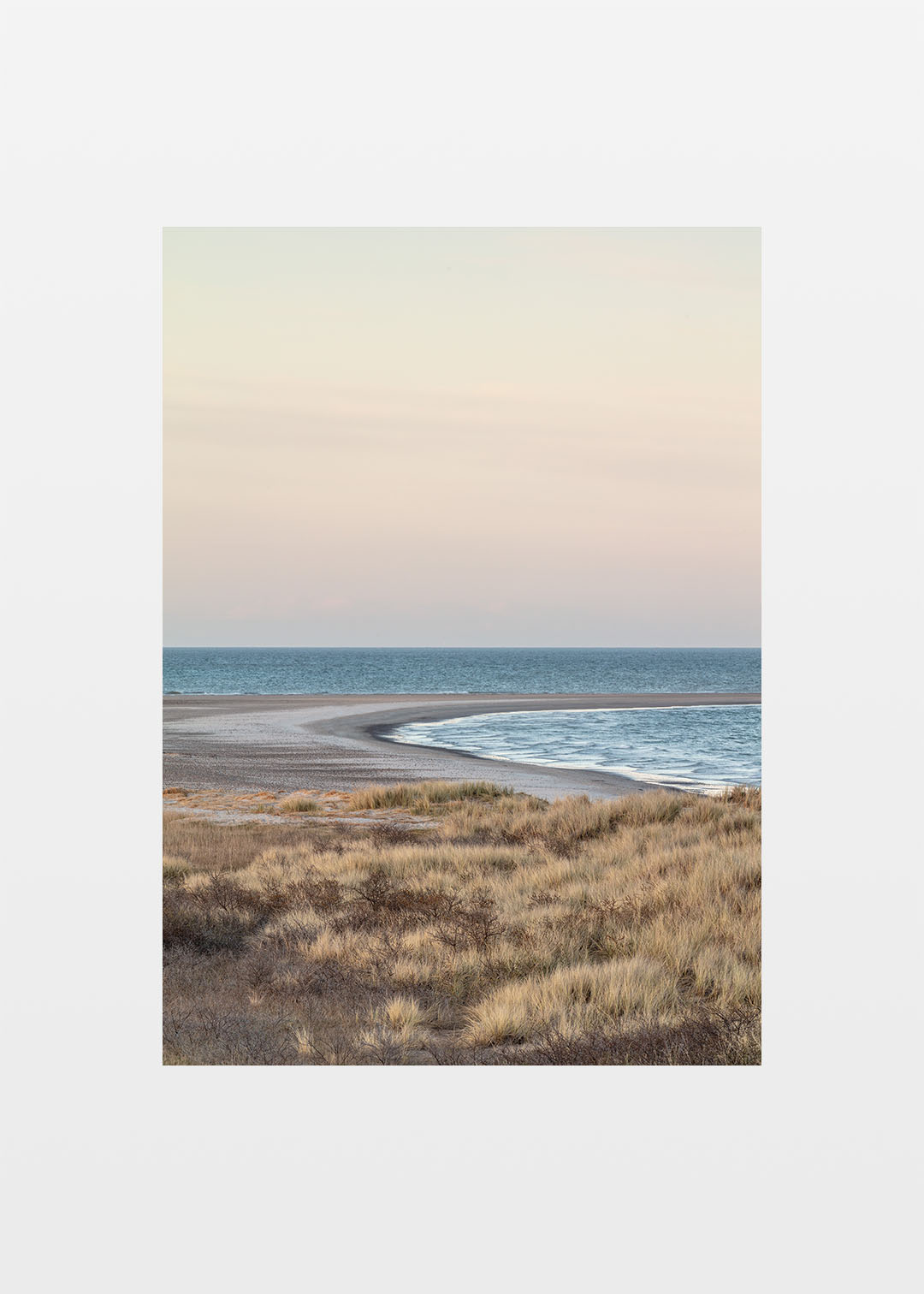 Grenen plakat af havet ved Danmarks nordligste punkt, hvor Skagerrak møder Kattegat. Dette fascinerende sted er kendt for sine unikke naturfænomener, hvor bølger og strøm fra de to have mødes og skaber et dramatisk landskab. På denne plakat er det hele fanget i det mest fantastiske lys, hvor elementerne danner en smuk komposition med havtorn og marehalm, og Grenen strækker sig ud i horisonten.