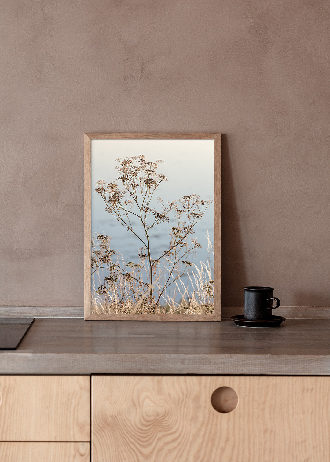 Gylden skærmplante plakat fanger den fredfyldte atmosfære ved fjorden, hvor en skærmplante står i forgrunden, oplyst af aftensolens gyldne stråler. Baggrunden spejler fjordens rolige vande, der skaber en harmonisk og nærmest meditativ stemning. Det varme lys fremhæver plantens fine detaljer og giver plakaten et blødt og naturligt udtryk, der bringer ro og fordybelse ind i hjemmet.
