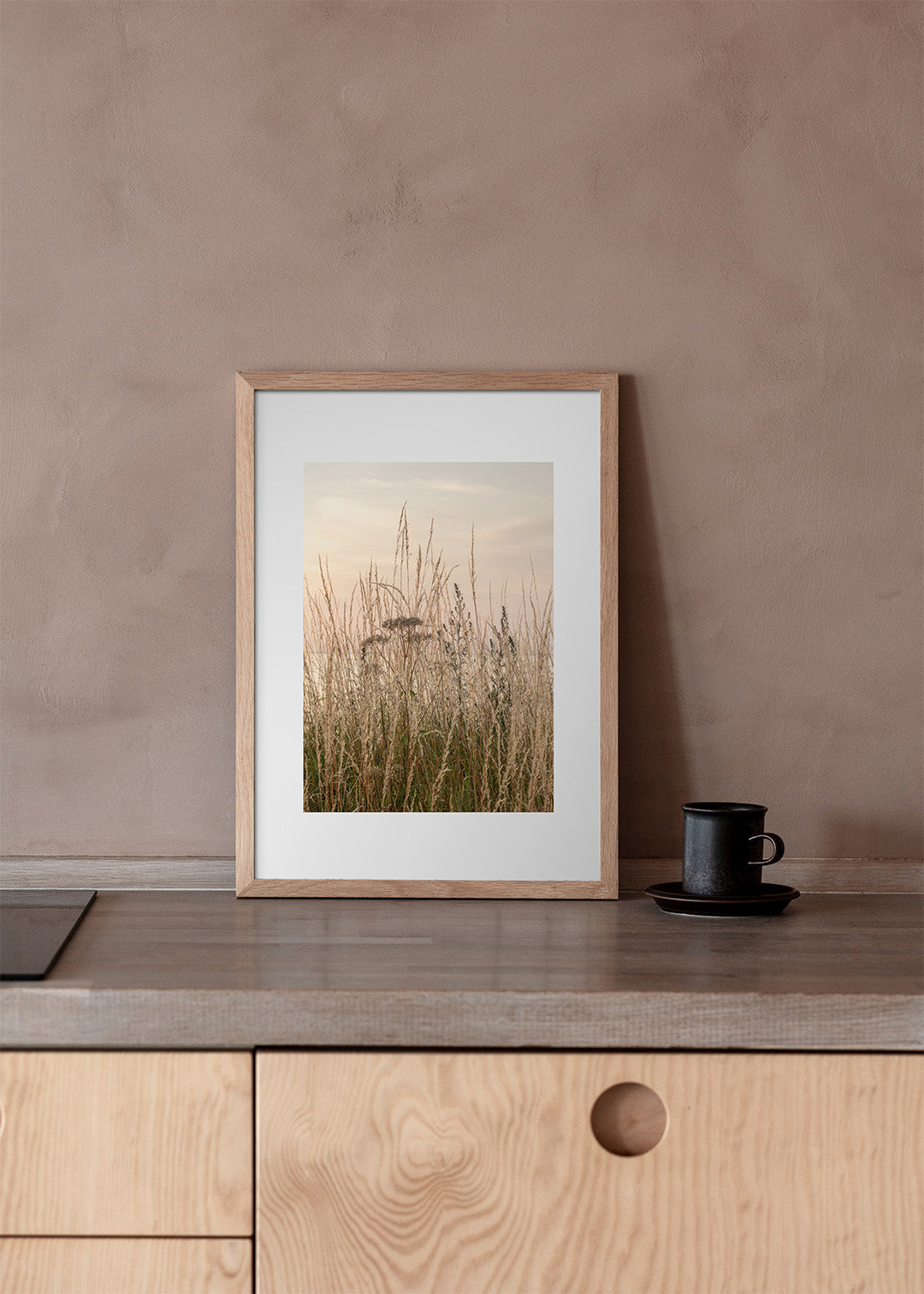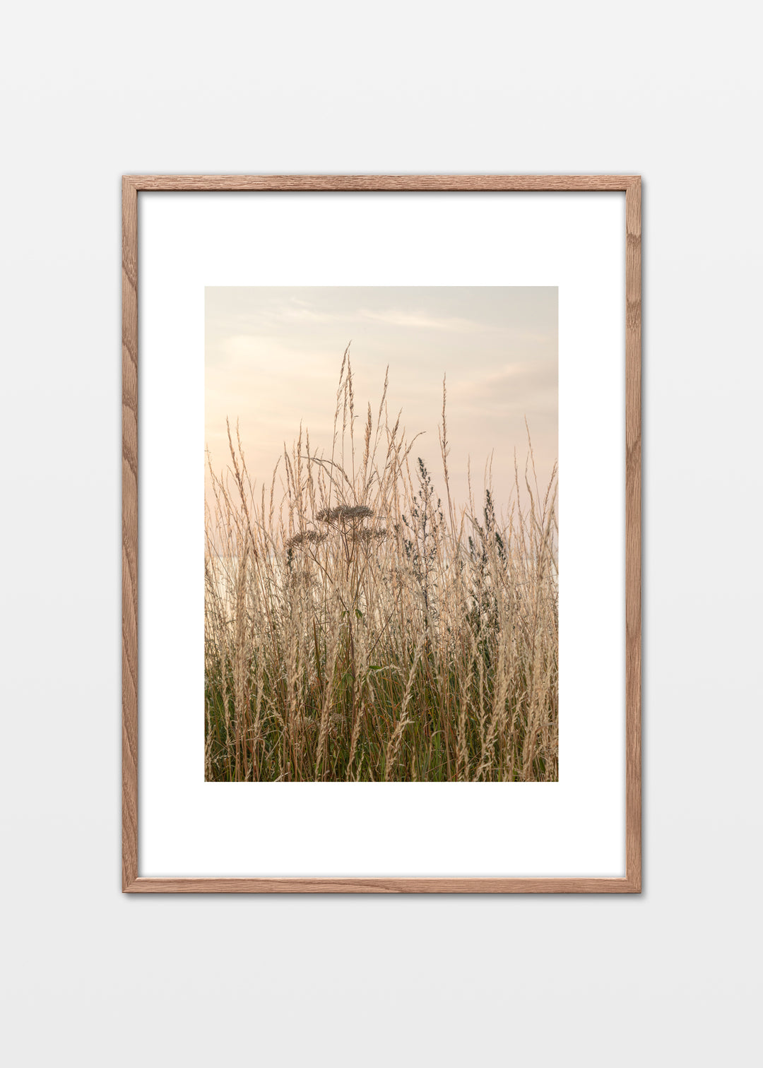 Stemningsfuld plakat med gyldent græs ved kysten på Gotland, Sverige. Fotografi med fokus på naturens enkle detaljer og bløde farver, der skaber en rolig og harmonisk atmosfære.