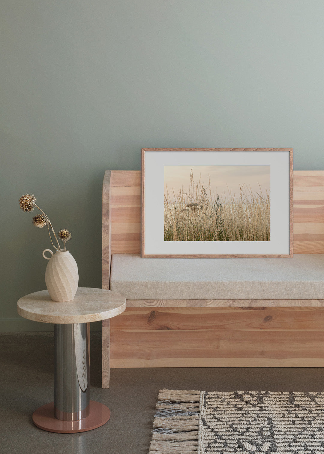 Stemningsfuld plakat med gyldent græs ved kysten på Gotland, Sverige. Fotografi med fokus på naturens enkle detaljer og bløde farver, der skaber en rolig og harmonisk atmosfære.