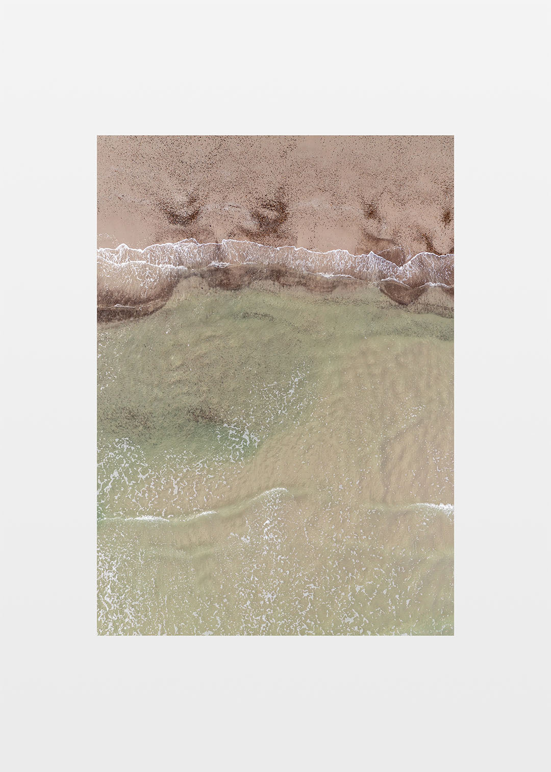 Set fra oven afslører Danmarks vestkyst en betagende symfoni af bølger og sand. Dette fotografi, taget med drone, fanger mødet mellem havet og stranden i bløde, naturlige farvetoner. Havets skvulpende bølger og sandets subtile mønstre skaber en rolig og næsten meditativ atmosfære.