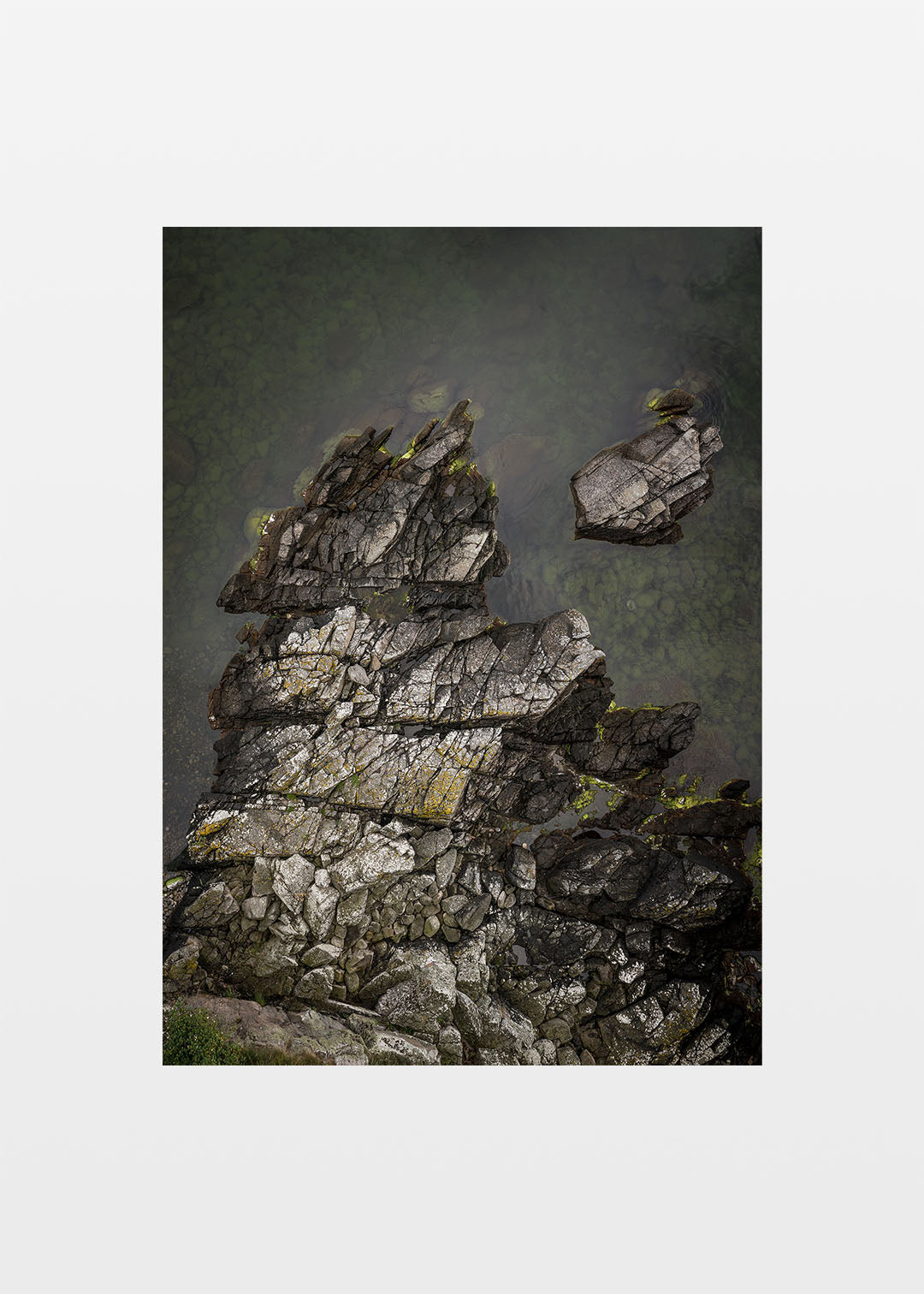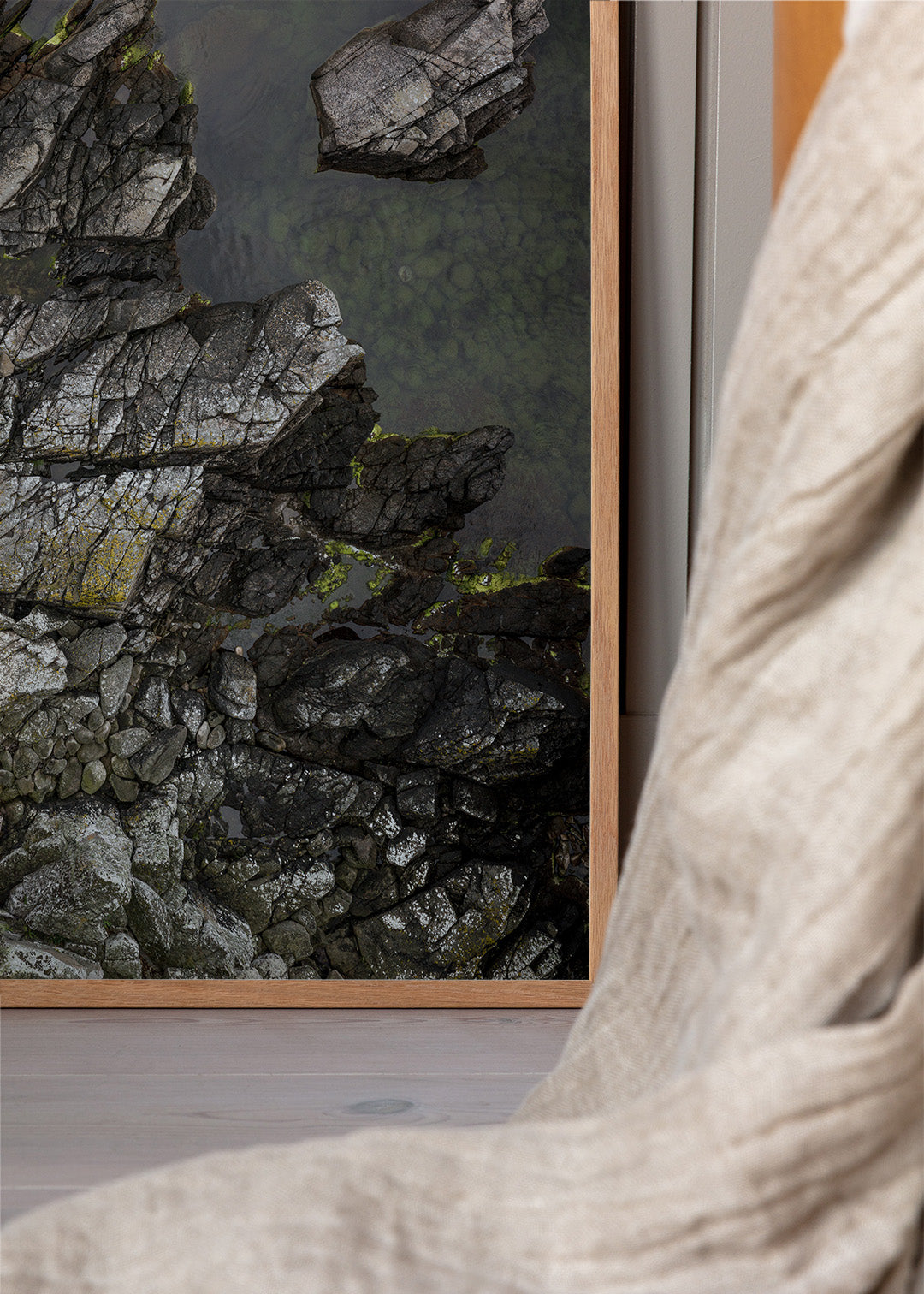 Vandet omkring klipperne lyser op i grønne nuancer på grund af algerne, der gror på stenene, og man kan se bunden på flere meters dybde. At opleve Helligdomsklipperne fra luften giver et unikt perspektiv, der fremhæver Bornholms særlige kystlinje. Dronefotografiet er sammensat af flere billeder for at opnå en høj opløsning, så man virkelig kan fordybe sig i detaljerne og forstørre plakaten op til 140x100 cm.