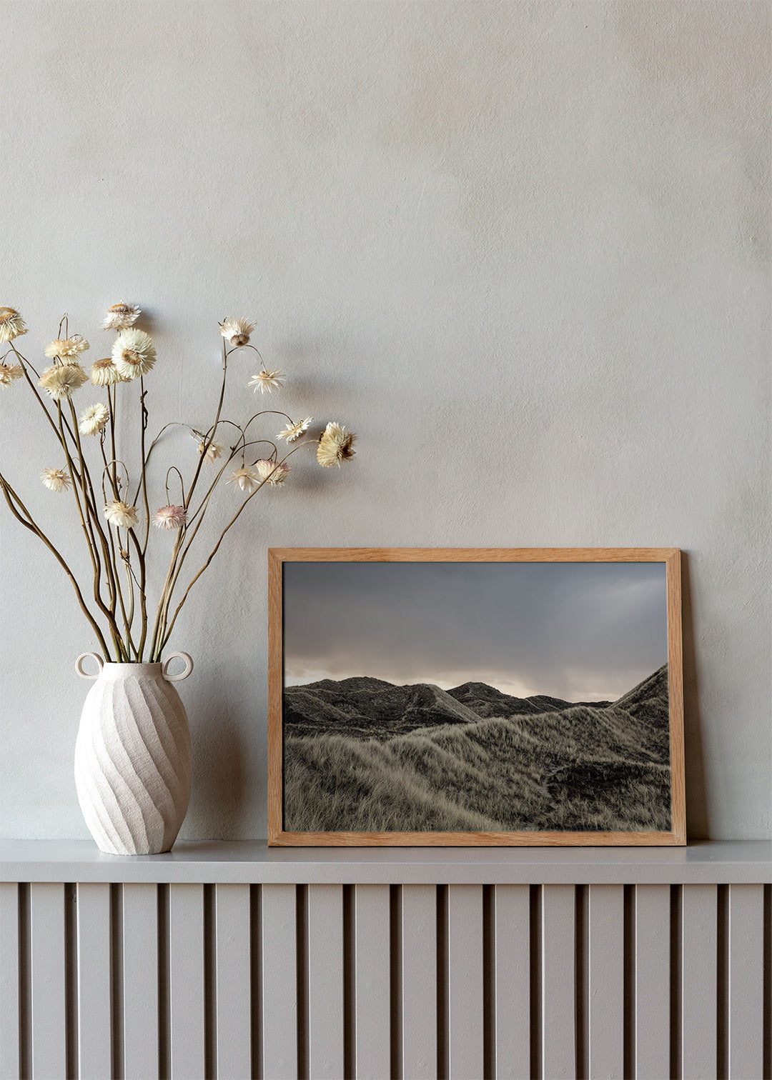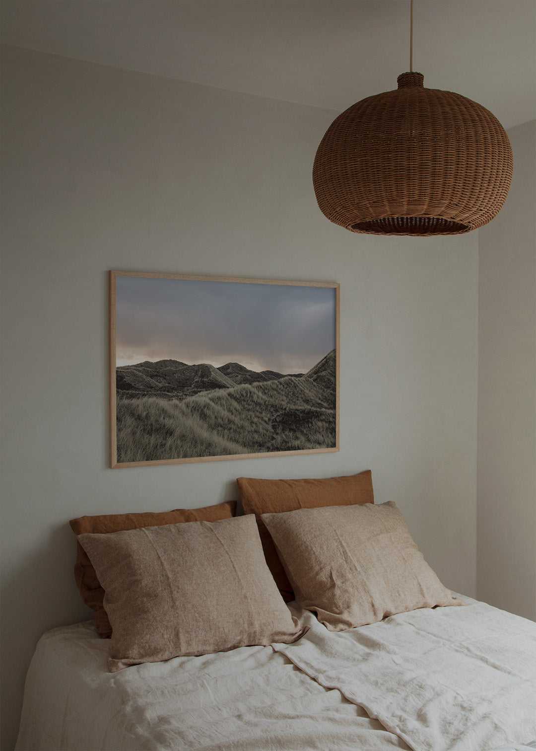 Mærk hvordan vores Klitlandskab plakat trækker dig ind i det dramatiske og klitlandskab i Thy. Den brede orientering af fotografiet tilføjer en ekstra dimension af dybde og vidde. Denne vandrette plakat kan være særligt effektfuld i bredere rum eller på vægge, der kunne drage fordel af et landskabsformat. Plakatens farveskala og motiv gør det til en alsidig tilføjelse til din indretning, uanset om du går efter en minimalistisk eller rustik stil.