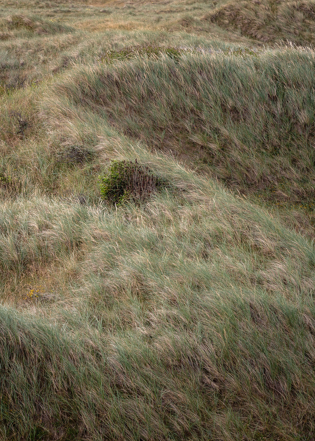 Klitterne ved Danmarks vestkyst skaber en sanselig oplevelse med deres bløde bakker og det karakteristiske marehalm, der danser i vinden. Dette fotografi indfanger det unikke landskab, hvor det vilde møder det rolige, og skaber en følelse af tidløshed. Den naturlige tekstur og de dæmpede grønne og sandfarvede toner fremhæver områdets rå skønhed.