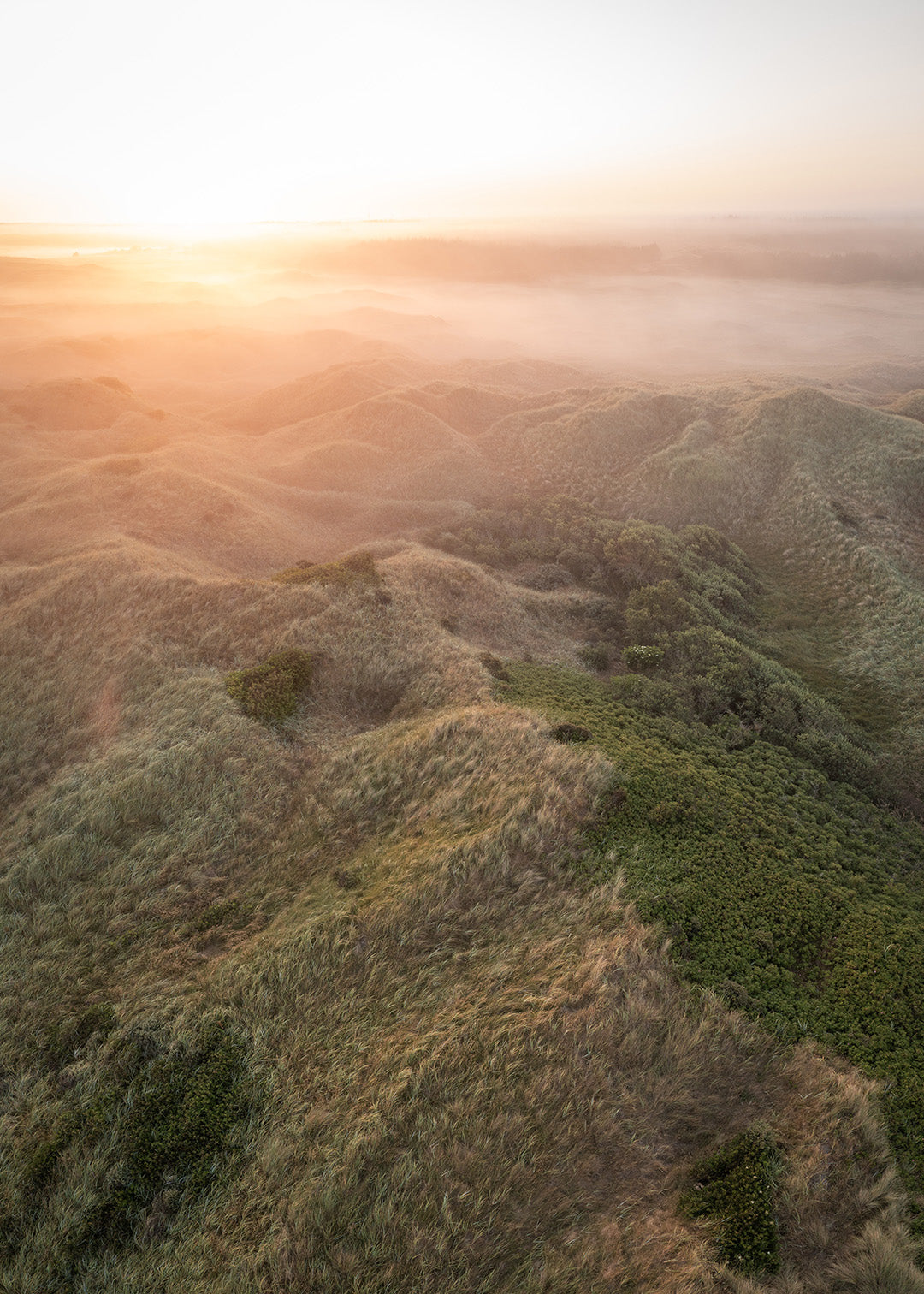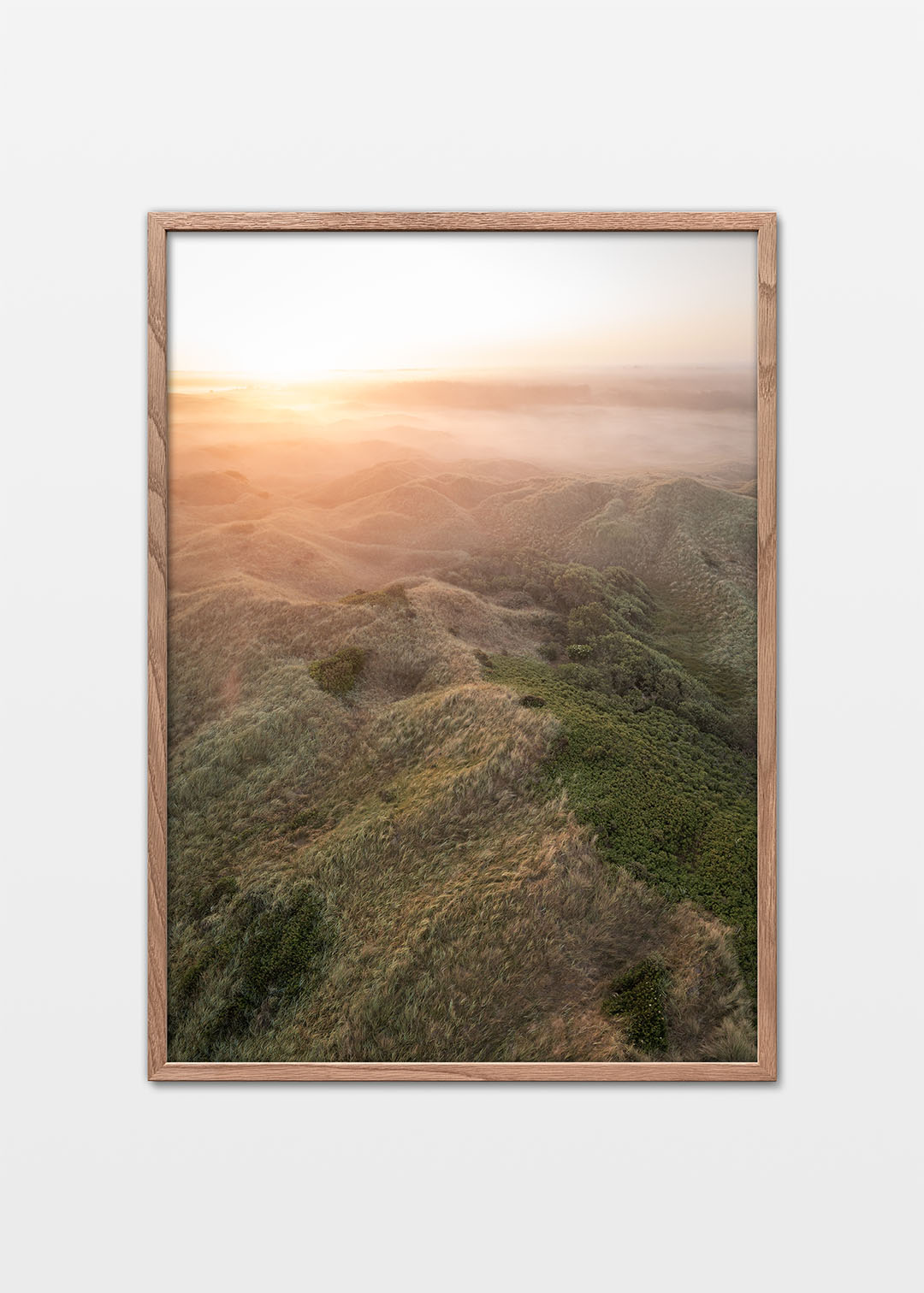 Klitter i morgenlys plakat indfanger det unikke landskab ved Blokhus set fra oven. Fotografiet viser klitternes bølgende former, oplyst af det gyldne morgenlys, som skaber en smuk kontrast mellem det grønne græs og de varmere nuancer i lyset. Motivet fanger den fredfyldte og harmoniske atmosfære, der kendetegner Danmarks nordvestkyst.