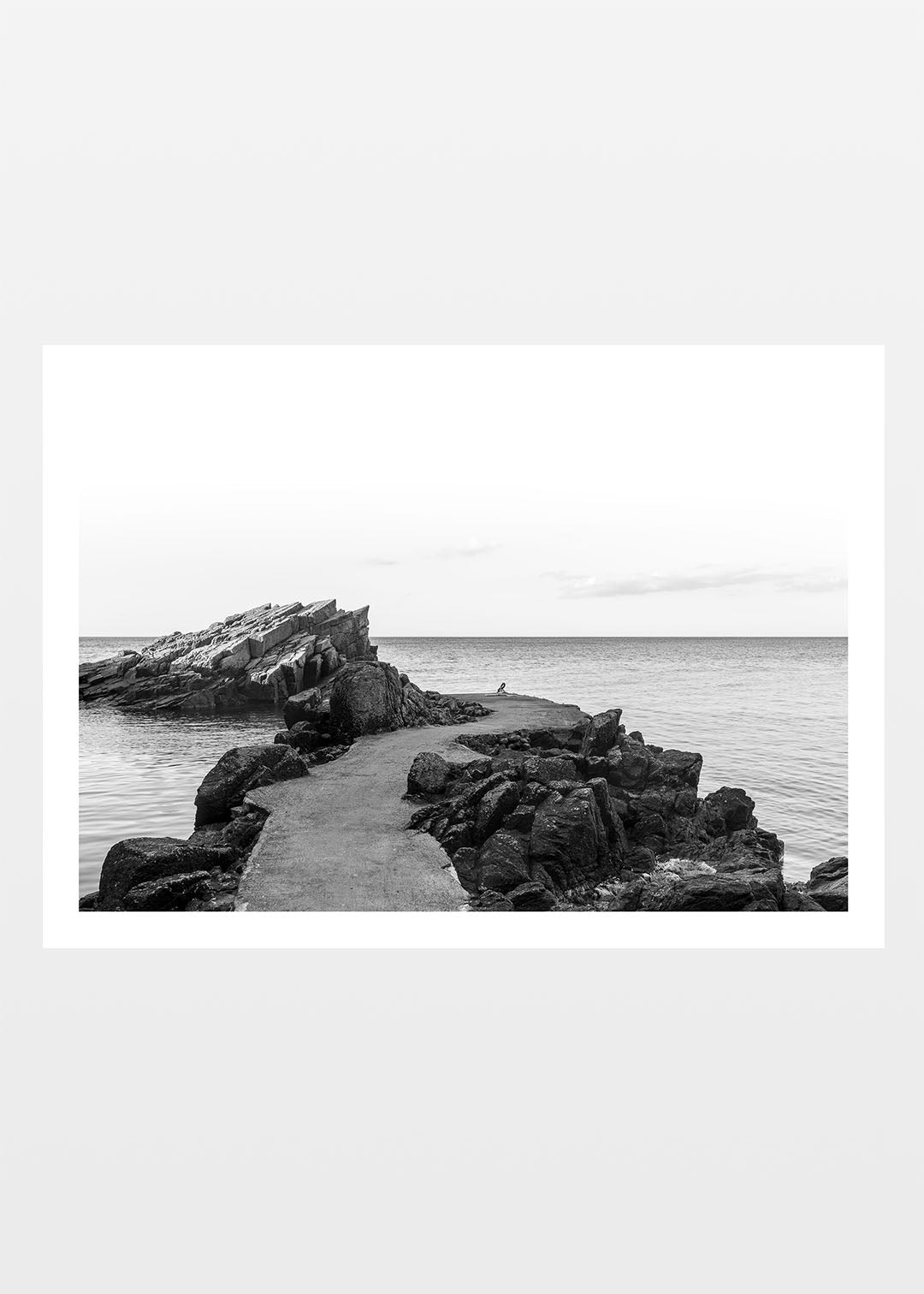 Sort-hvid plakat med motiv af en sti, der fører dig over klipperne og ud til vandet ved den barske klippekyst. Solen bager på de mørke klipper, der står i skarp kontrast til den lyse himmel. Vi befinder os ved de imponerende Helligdomsklipper på Bornholm, hvor klipperne bryder vandets overflade og skaber en dramatisk overgang mellem det hårde og det bløde. Plakaten fanger øjeblikket, hvor naturens kontraster skaber en rolig, men kraftfuld stemning, og indbyder til fordybelse.