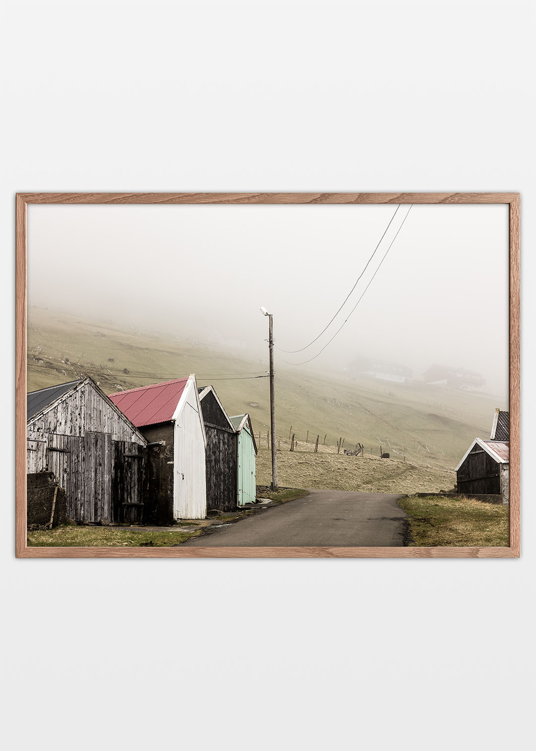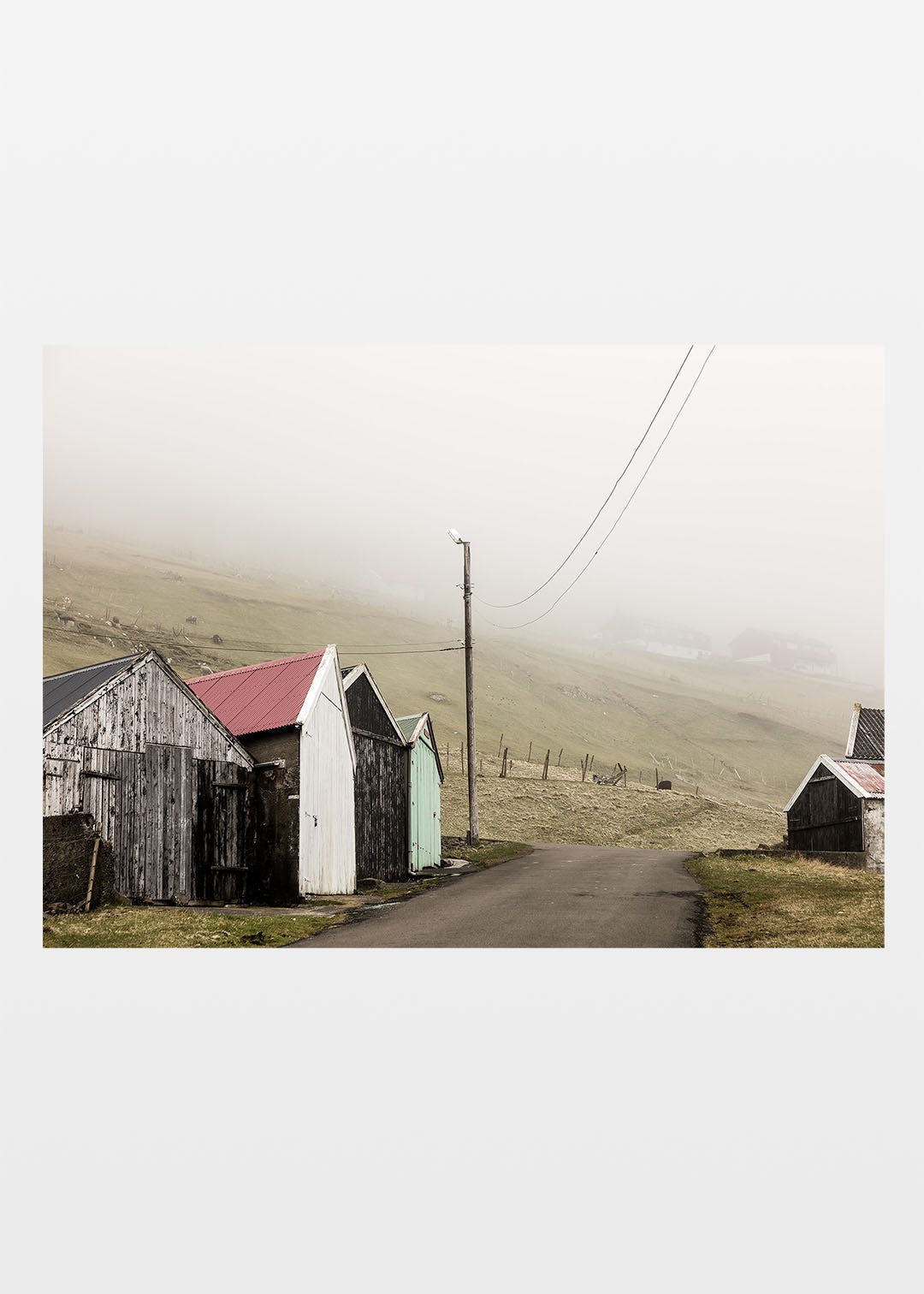 Fiskerhus plakat fra en lille bygd på Færøerne. Den snoede vej slutter blindt ved de små fiskerhuse, som står slidte og vejrbidte efter mange år i det barske klima. I husene opbevarer fiskerne deres grej og både, som skal holdes i god stand for at kunne klare Nordatlantens kræfter. At sætte de små både i vandet og begive sig ud på havet virker som et vovestykke, men fiskerne kender havet og ved, hvornår det er sikkert at sejle. Fotografiet er taget på en stille og diset dag, hvor det typiske færøske vejr skaber en stemning af ro og eftertænksomhed.