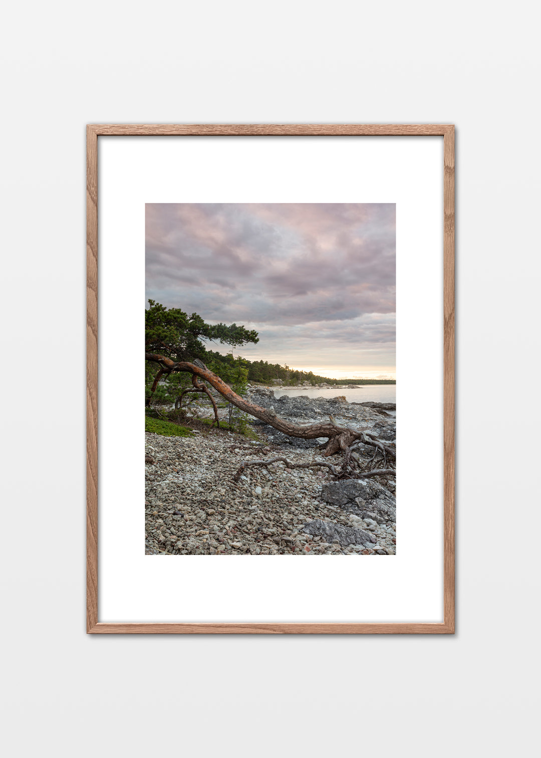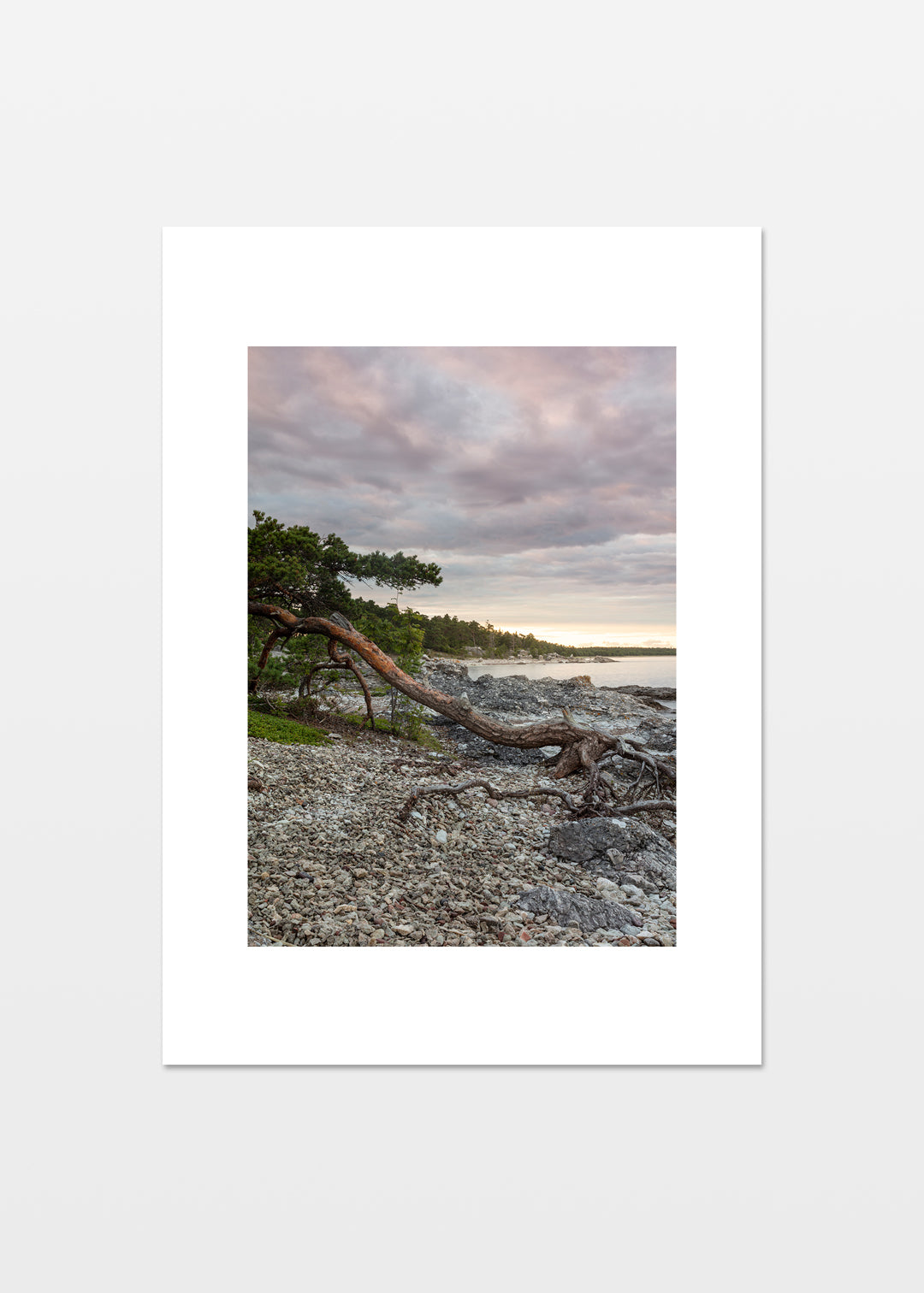 Kysten nord for Ljugarn på Gotland byder på et dramatisk møde mellem klipper, strand og hav. I forgrunden ses et karakteristisk fyrretræ, der med sine krogede grene strækker sig ud mod kysten, mens klippelandskabet fortsætter langs horisonten. De bløde pastelfarver i himlen spejler sig i det rolige vand og skaber en harmonisk stemning.
