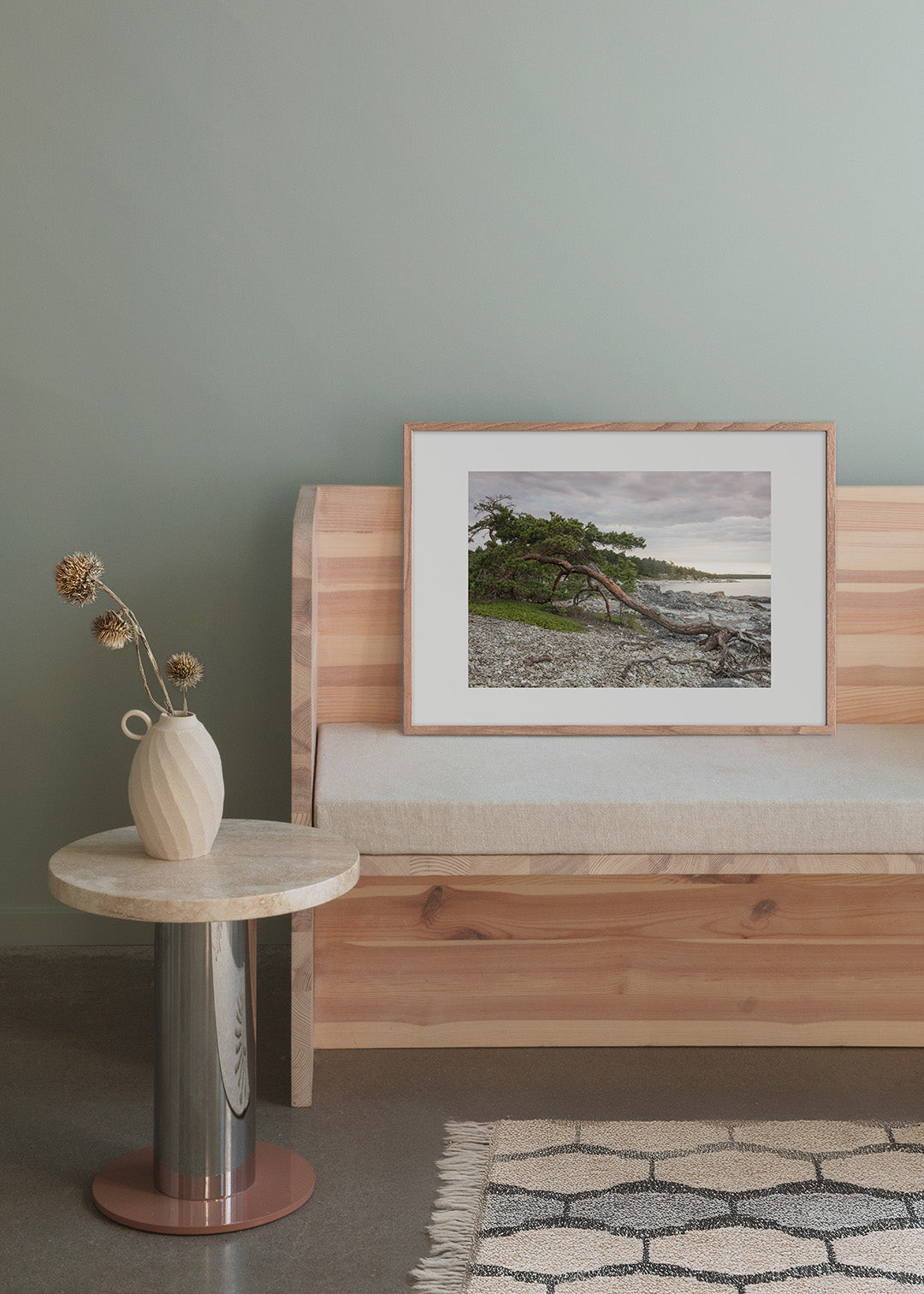 Kysten nord for Ljugarn på Gotland er præget af dramatiske klipper, krogede fyrretræer og en fredfyldt havudsigt. Denne vandrette komposition fremhæver både den rå klippekyst og de rolige farver i aftensolen, der giver motivet en balanceret og indbydende stemning.