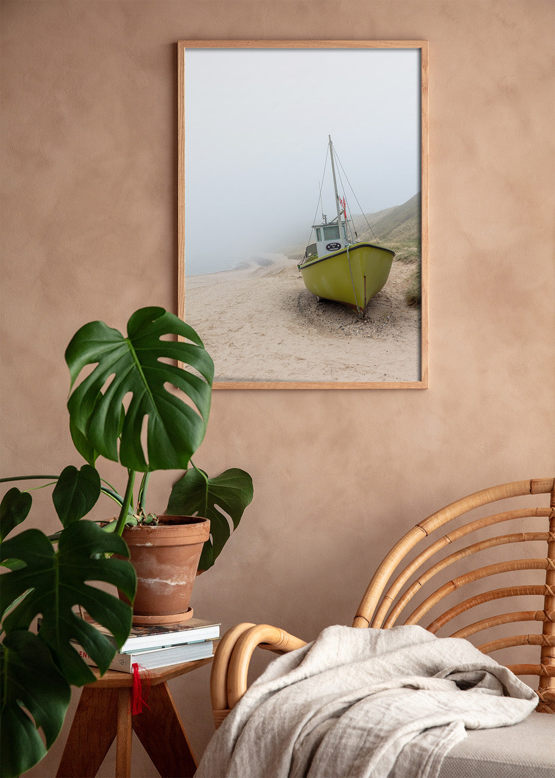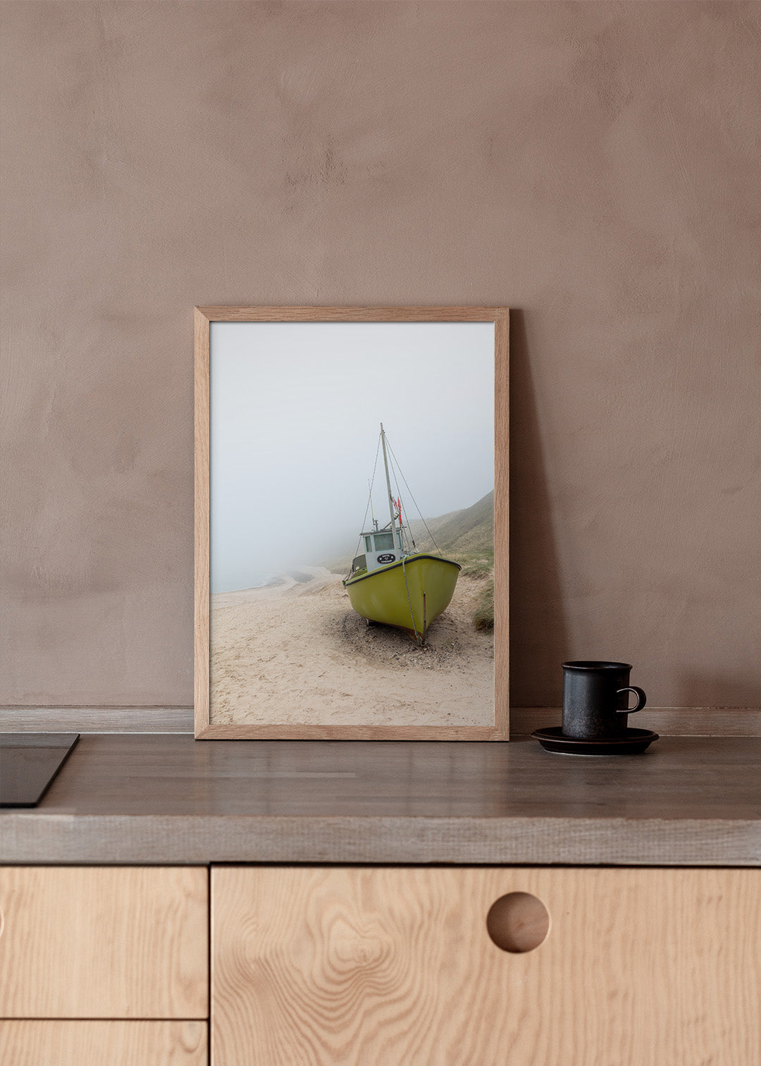 Oplev den stille morgen i Lønstrup med vores Lønstrup plakat, hvor en fiskebåd ses i den bløde morgendis. Dette øjeblik er fanget i en atmosfære af ro og eftertænksomhed, perfekt til at bringe naturens beroligende effekt ind i dit hjem.
