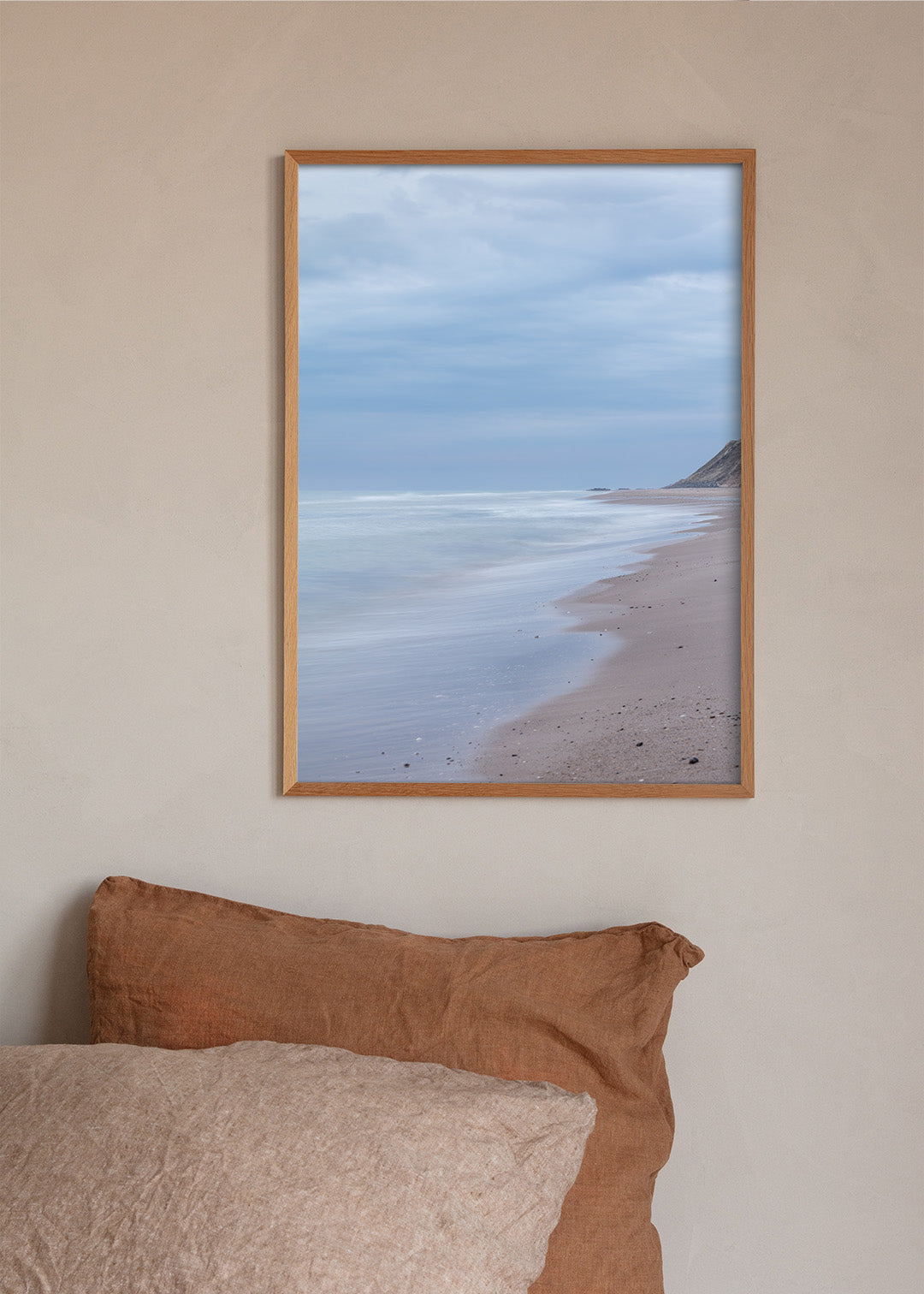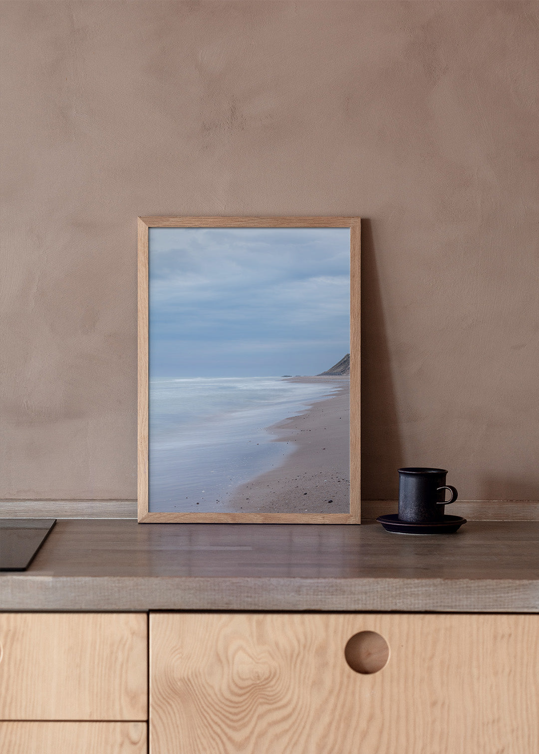 Vores Lønstrup Strand plakat præsenterer et fotografi taget i den blå time, hvor det bløde blå lys smukt fremhæver strandens rolige atmosfære. Dette lys skaber en fredfyldt stemning, der indbyder til eftertænksomhed og fokus i ethvert rum.