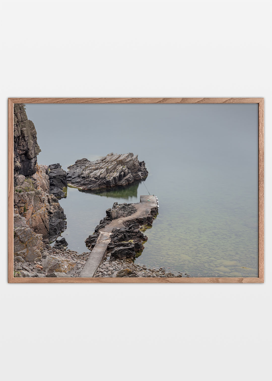 Plakat af naturhavnen ved Liebertsklippen på Bornholm, set fra toppen af de imponerende Helligdomsklipper. En tidlig morgen, hvor vi var de eneste på klipperne, kunne vi nyde udsigten over den lille naturhavn, der ligger i læ, og hvor vandet ligger som et spejl, kun brudt af de dramatiske bornholmske klipper. Fotografiet fanger kontrasterne mellem de hårde klippeformationer og det rolige vand, hvilket skaber en smuk balance i motivet.