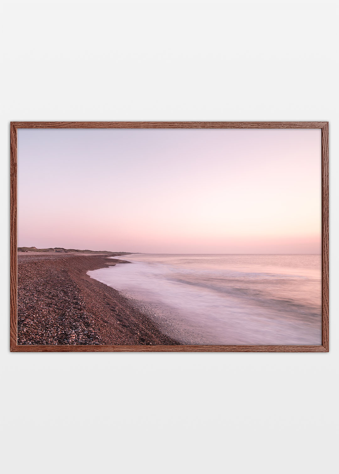 Rosa aftenlys plakat indfanger den rolige skønhed ved Klitmøller, hvor aftenhimlen lyser op i rosa toner og kaster et blidt skær over kysten. Fotografiet viser vestkystens rå og uforstyrrede landskab, når dagen går på hæld, og bølgerne ruller stille ind mod stranden. Dette motiv bringer naturens fredfyldte skønhed og nordiske enkelhed ind i hjemmet.
