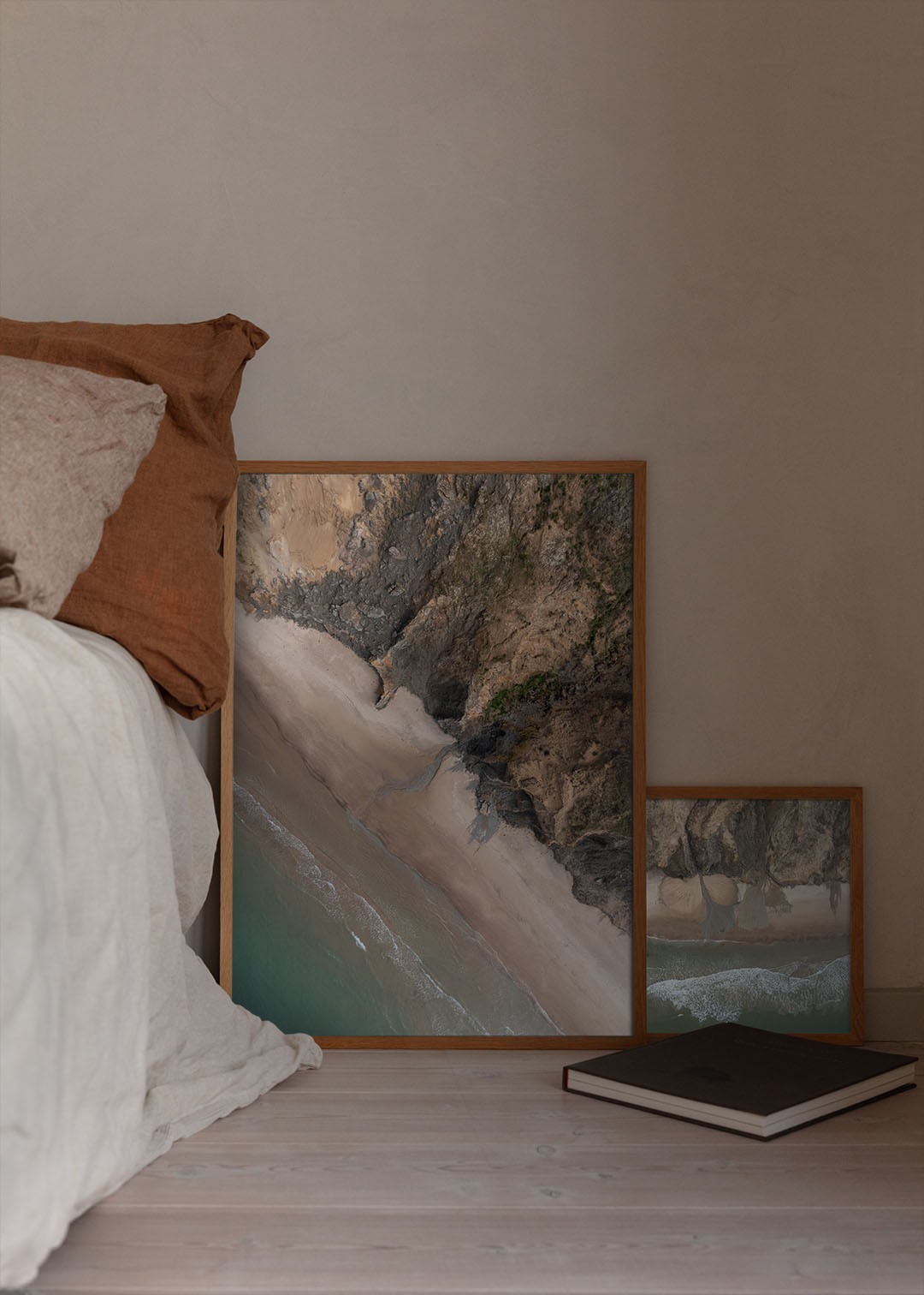 Oplev skønheden ved Rubjerg Knude med vores eksklusive drone-plakat. Fotografiet, taget med drone, fanger de dramatiske, mørke skrænter, som møder den bløde sandstrand og det indbydende grønne hav. Denne unikke plakat er designet til at kunne hænge både vertikalt og horisontalt, hvilket giver fleksible ophængningsmuligheder til enhver indretning.