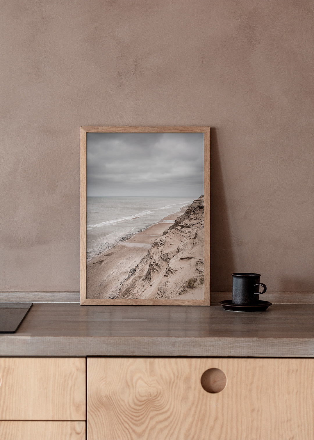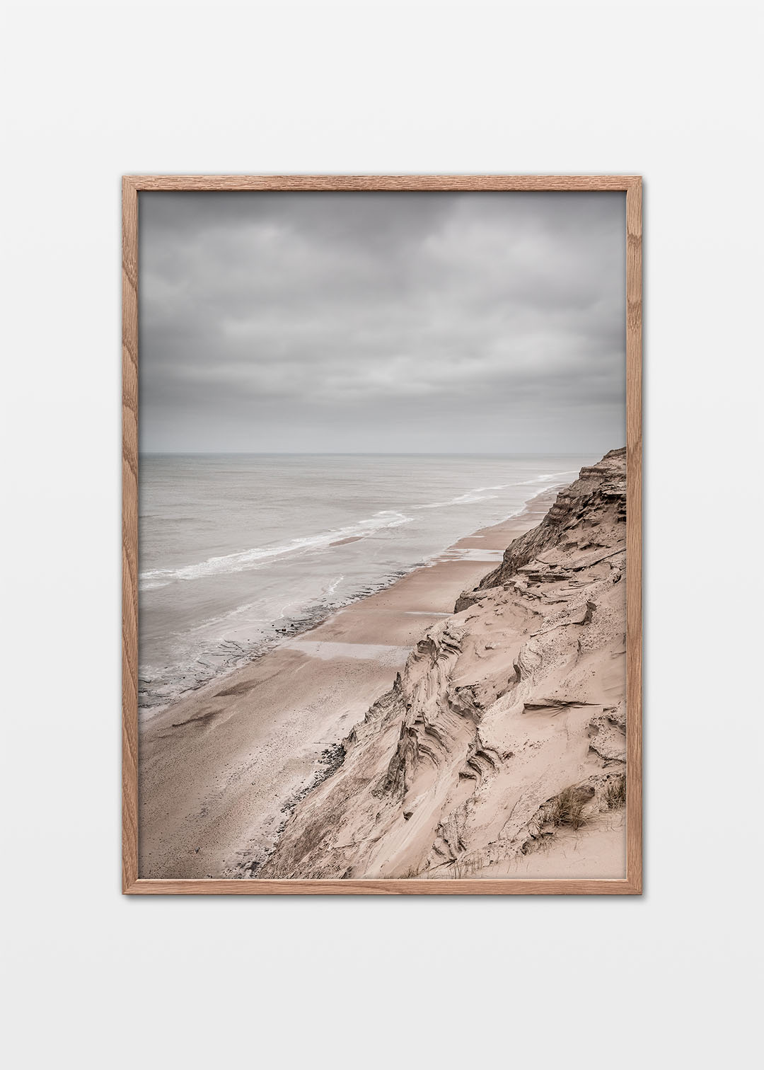 kendt for sine stejle skrænter og det sand, der langsomt har begravet det ikoniske fyr. I dette motiv er fyrtårnet ikke i fokus, men derimod naturens kræfter, der uophørligt former landskabet og udfordrer skrænterne. Skræntens dramatiske linjer og det vilde Vesterhav skaber en stemningsfuld og rå komposition, der indfanger den jyske vestkysts unikke skønhed. Plakaten er printet på høj kvalitets papir med en professionel fotoprinter, hvilket sikrer, at alle detaljer og nuancer i landskabet bliver levende gengivet. Dette motiv bringer den vilde og barske natur fra Rubjerg Knude ind i hjemmet og skaber en følelse af frihed og drama.