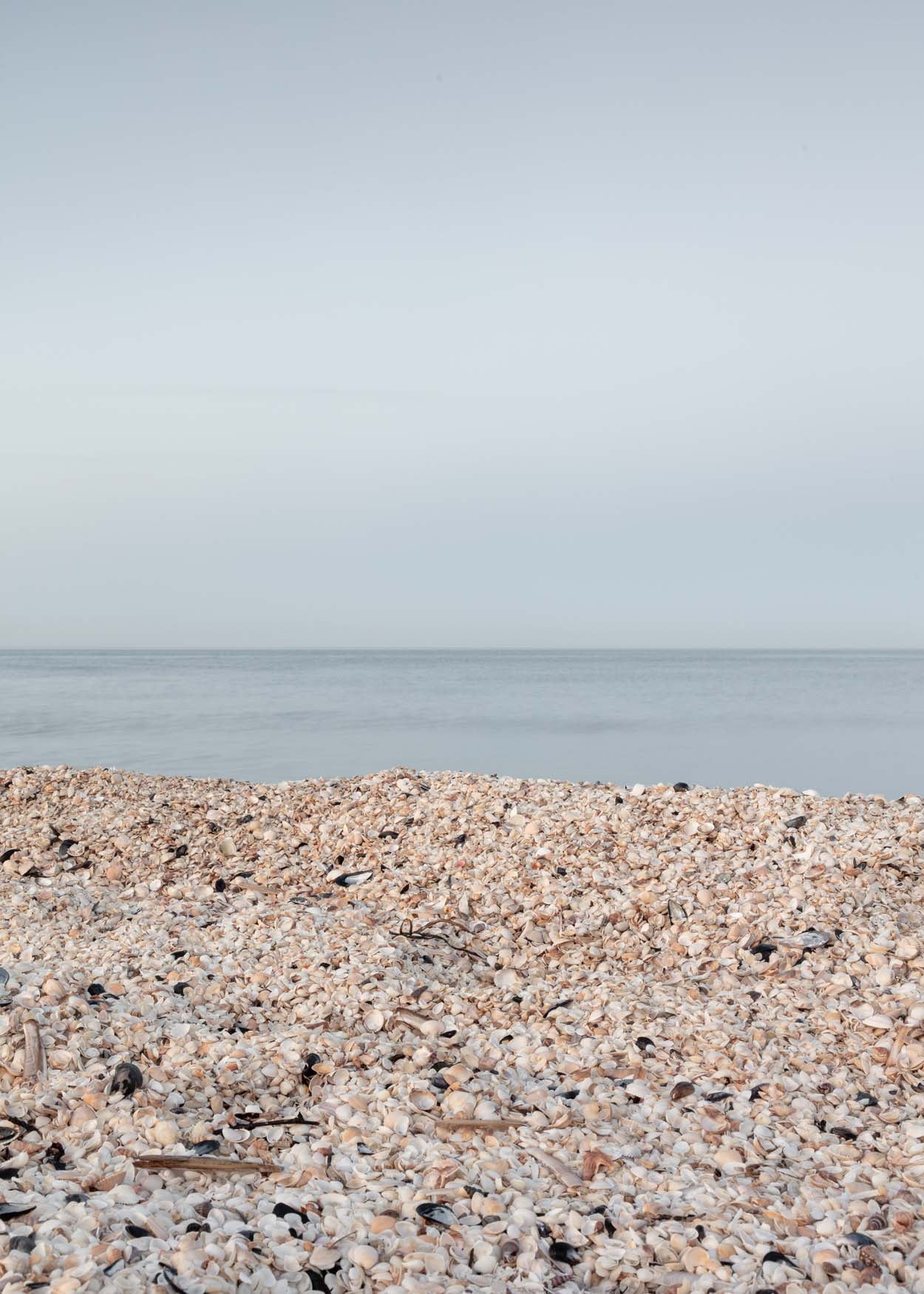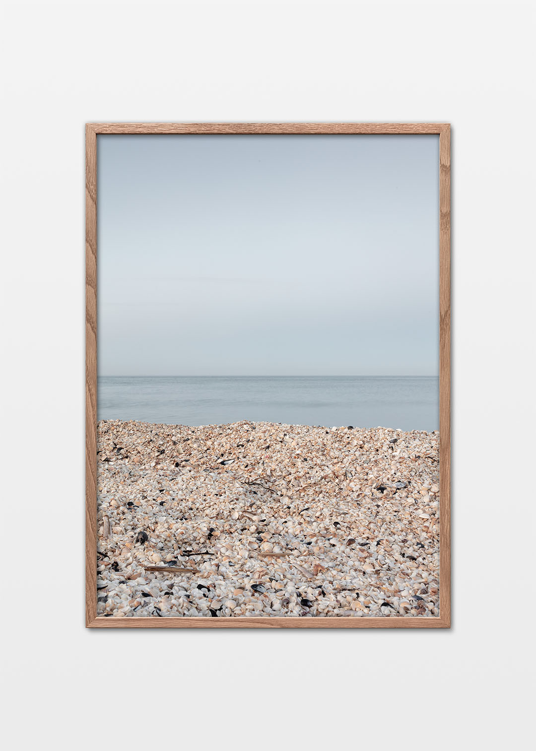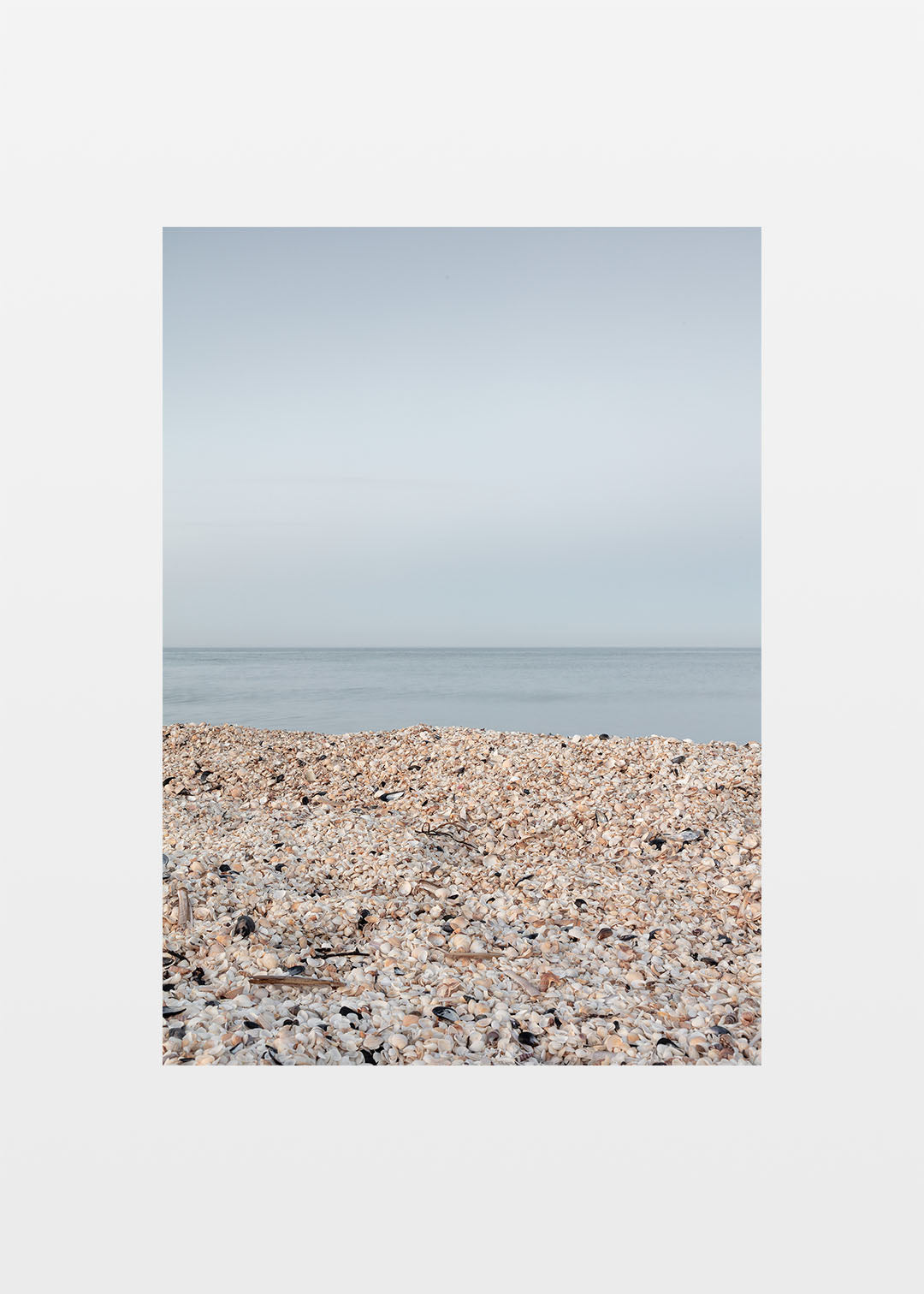Sæby plakat viser det fascinerende mønster af muslingeskaller, der ligger spredt på Sæby Nordstrand. Stranden er fyldt med muslingeskaller, og fotografiet er taget efter solnedgang, hvor lyset er blødt og skaber en smuk kontrast mellem de lyse skaller og det mørke vand. Denne detalje giver plakaten et eksotisk udtryk, som man ellers ville forbinde med fjernere kyster end Nordjyllands østkyst.