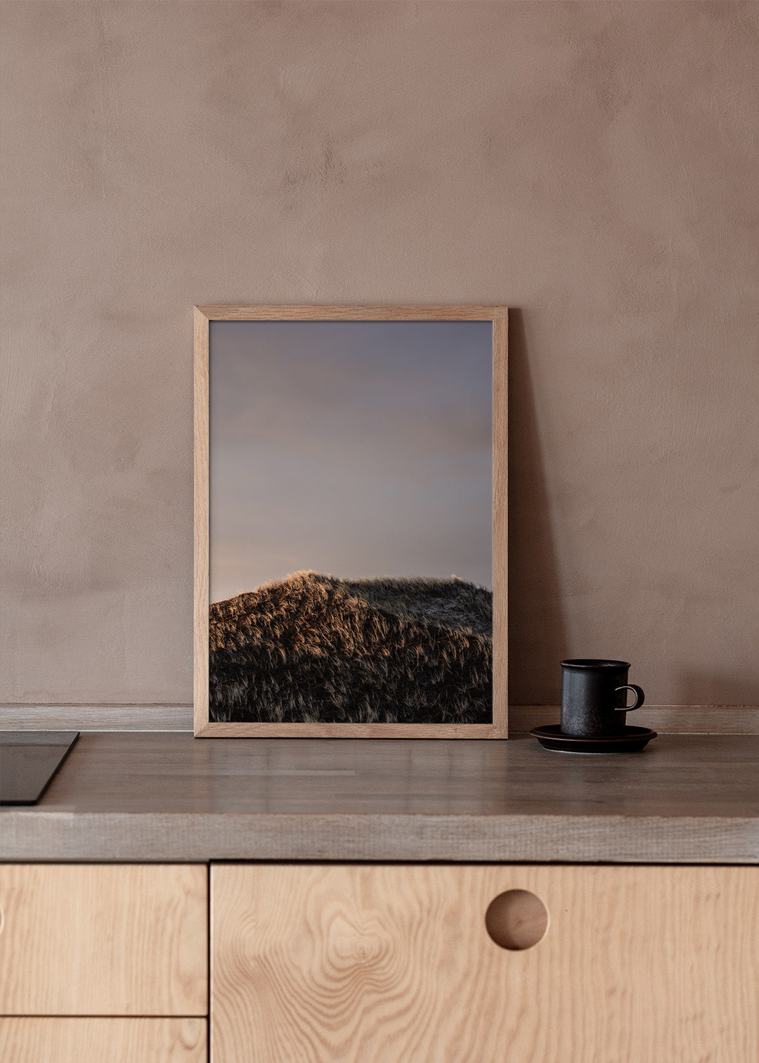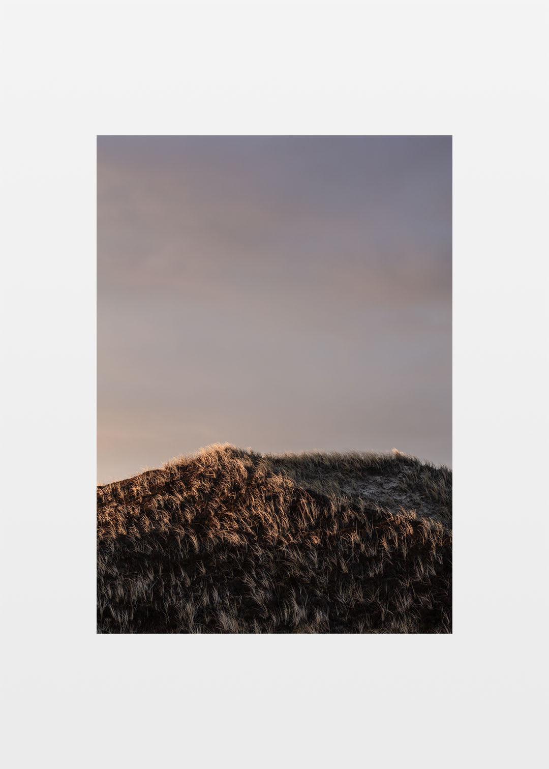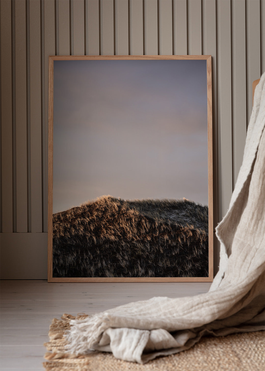 Vores Sandklit plakat byder på en enestående skildring af Nationalpark Thy. Billedet er indfanget i den aftagende sol, der kærtegner en markant sandklit, mens det omgivende terræn henligger i mørke. Fotografiet zoomer ind på de smukke detaljer i det græsbeklædte landskab, og fremhæver klittens mørke nuancer.