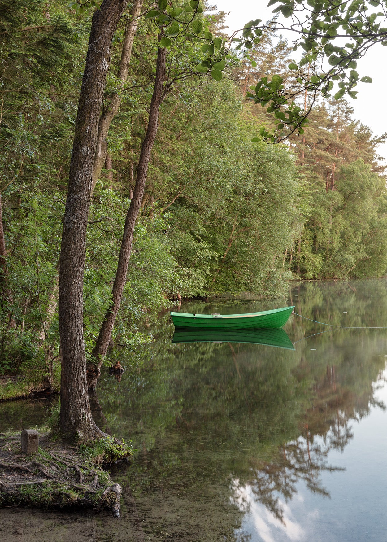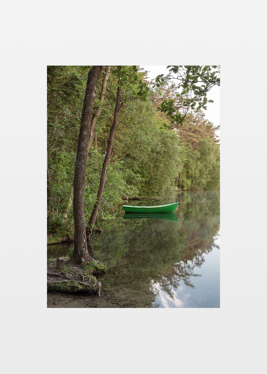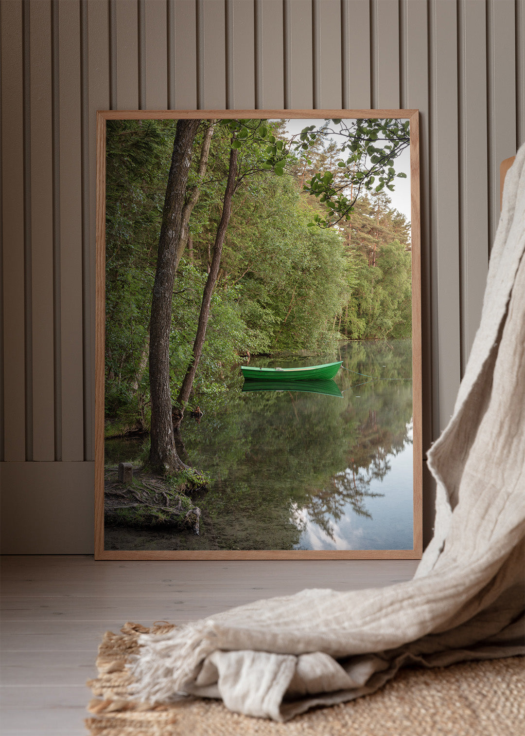 Silkeborg plakat af en af de smukke Silkeborgsøer, der ligger som perler på en snor omkring byen. Det er en magisk oplevelse at stå ved søbredden en tidlig sommermorgen, hvor disen rejser sig fra vandet, og den friske luft føles kølig mod huden. Den grønne båd ligger stille i det blanke vand, mens fuglene skaber en symfoni af kvidder i det smukke landskab.