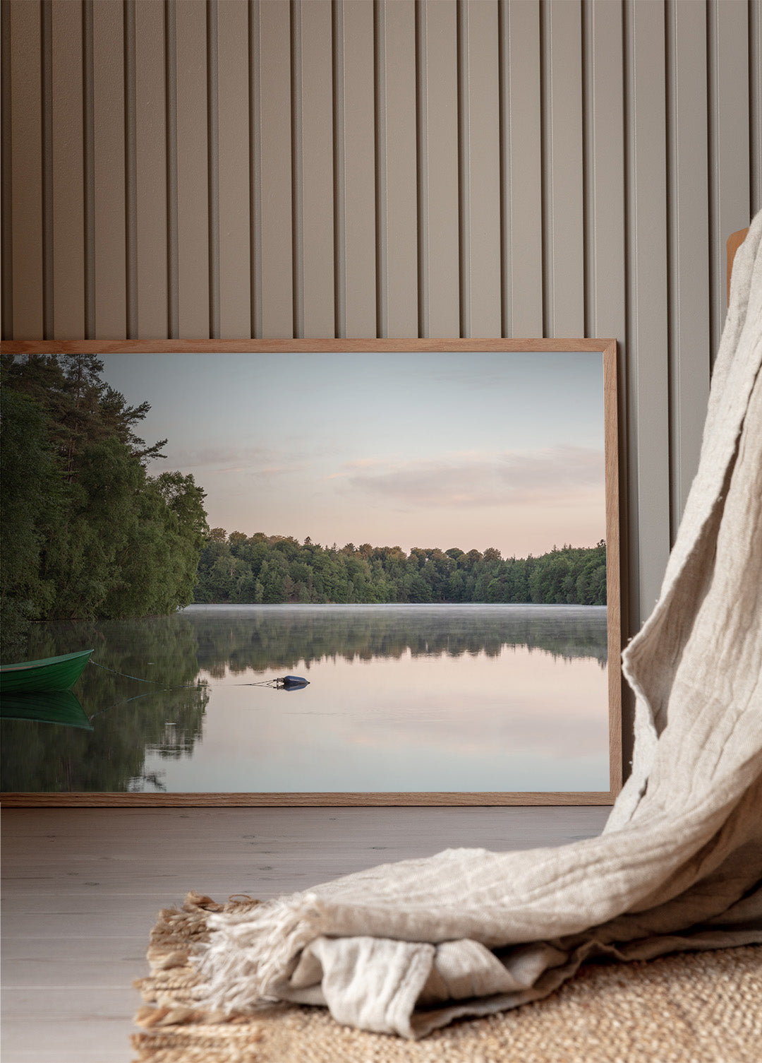 Silkeborg plakat fra en af de smukke søer ved Silkeborg i Midtjylland. Det er en magisk oplevelse at stå ved søbredden en tidlig sommermorgen, hvor den grønne båd ligger stille i det blanke vand, og disen rejser sig fra søens overflade. Den kølige luft fylder lungerne, og stilheden brydes kun af fuglenes intense kvidder, der skaber et fortryllende lydbillede i den smukke natur.