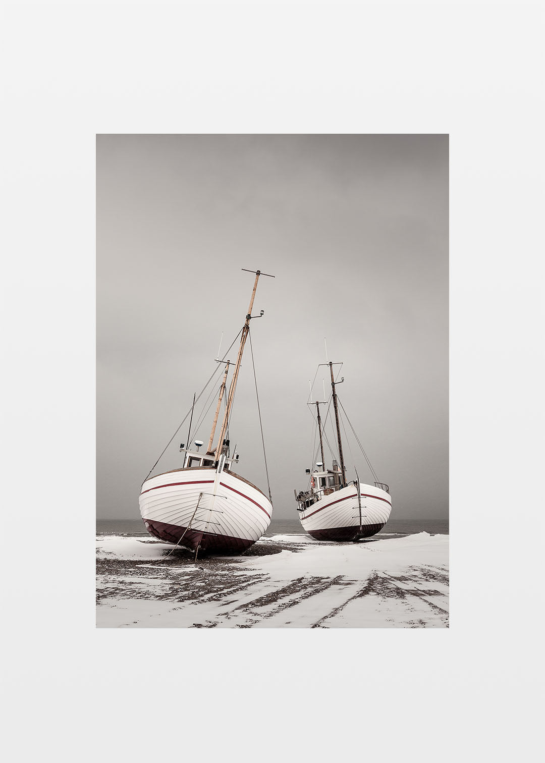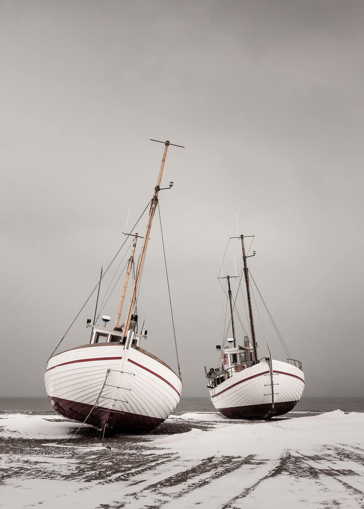 Plakat af fiskebåde ved Slettestrand. Bådene ligger på stranden hele vinteren og venter på at stikke til søs, når sommeren kommer. Slettestrand er et af de få steder, hvor de gamle både stadig bruges til sejlads, og stranden har sit eget bådebyggerværksted, hvor bådene renoveres og får nyt liv. Fotografiet til vores Slettestrand plakat er taget på en kold vinterdag i snevejr, hvor de mørke skyer og sneen skaber et særligt lys og en stemningsfuld atmosfære. Plakaten er printet på høj kvalitets papir med en professionel fotoprinter, hvilket sikrer, at alle detaljer og nuancer i landskabet bliver levende gengivet. Dette motiv indfanger den rå skønhed ved den danske vestkyst og bringer en følelse af ro og historie ind i hjemmet.