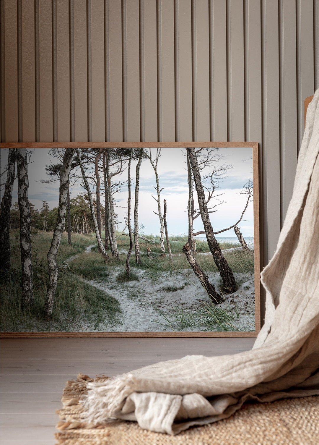 Motivet viser de smalle skovstier tæt ved stranden, hvor havet anes gennem trætoppene. Lyset omkring solnedgang får skovbunden til at gløde, og himlen skifter farve, mens solen går ned over horisonten. Dette øjeblik, hvor skov og strand mødes i en harmoni af farver og lys, er fanget i denne plakat, der bringer ro og fordybelse ind i hjemmet.