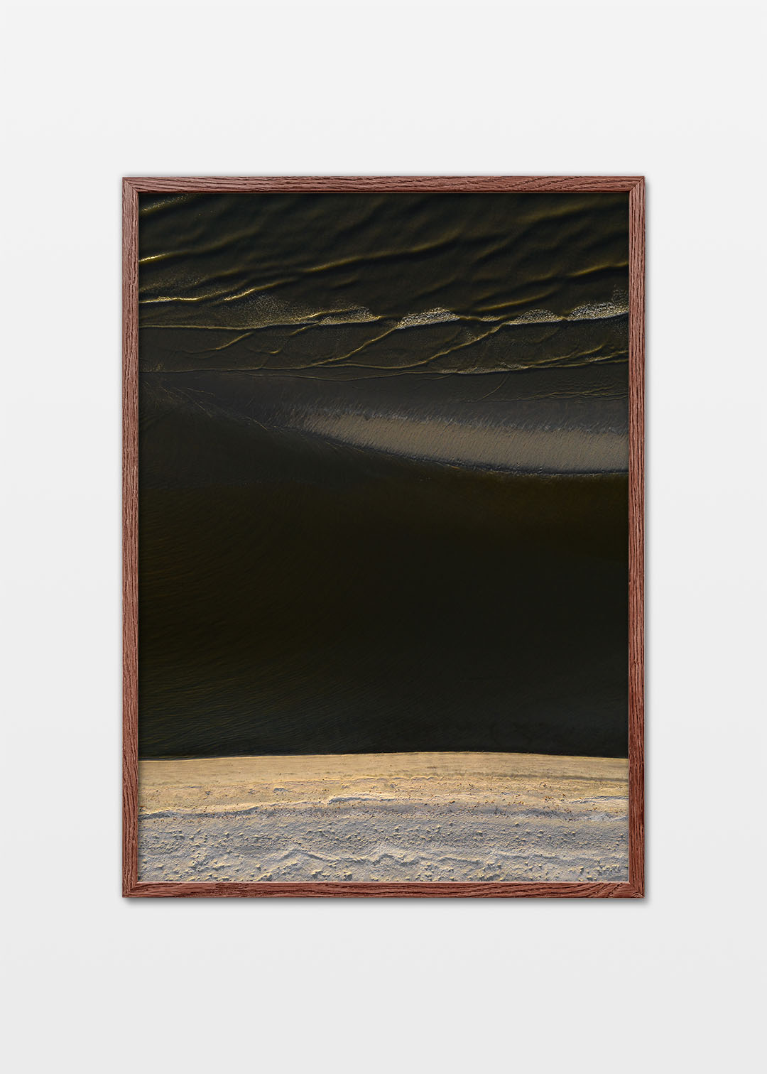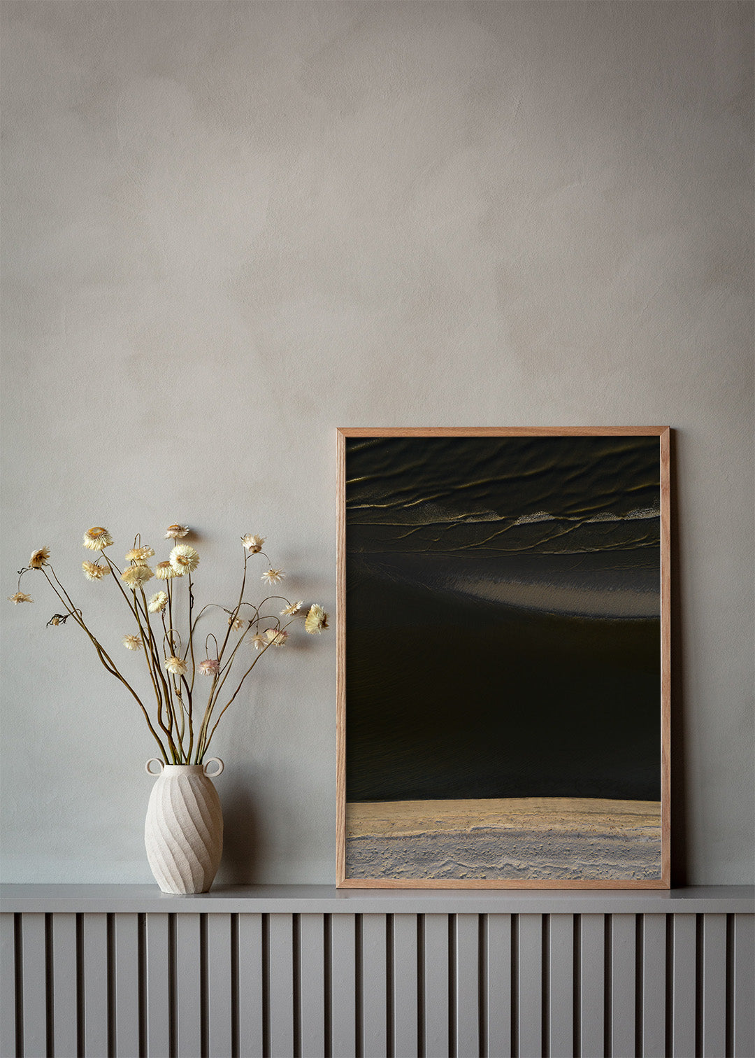 Fotografiet til vores droneplakat fra Sæby Strand er fra den helt tidlige morgen hvor solen bryder horisonten og kaster det varme lys på den flade strand. Det giver et varmt lys, og stranden og skallerne lyser i de smukkeste farver. Plakaten er enkel og grafisk, og vandet ser mørkt ud på grund af solens lave vinkel.