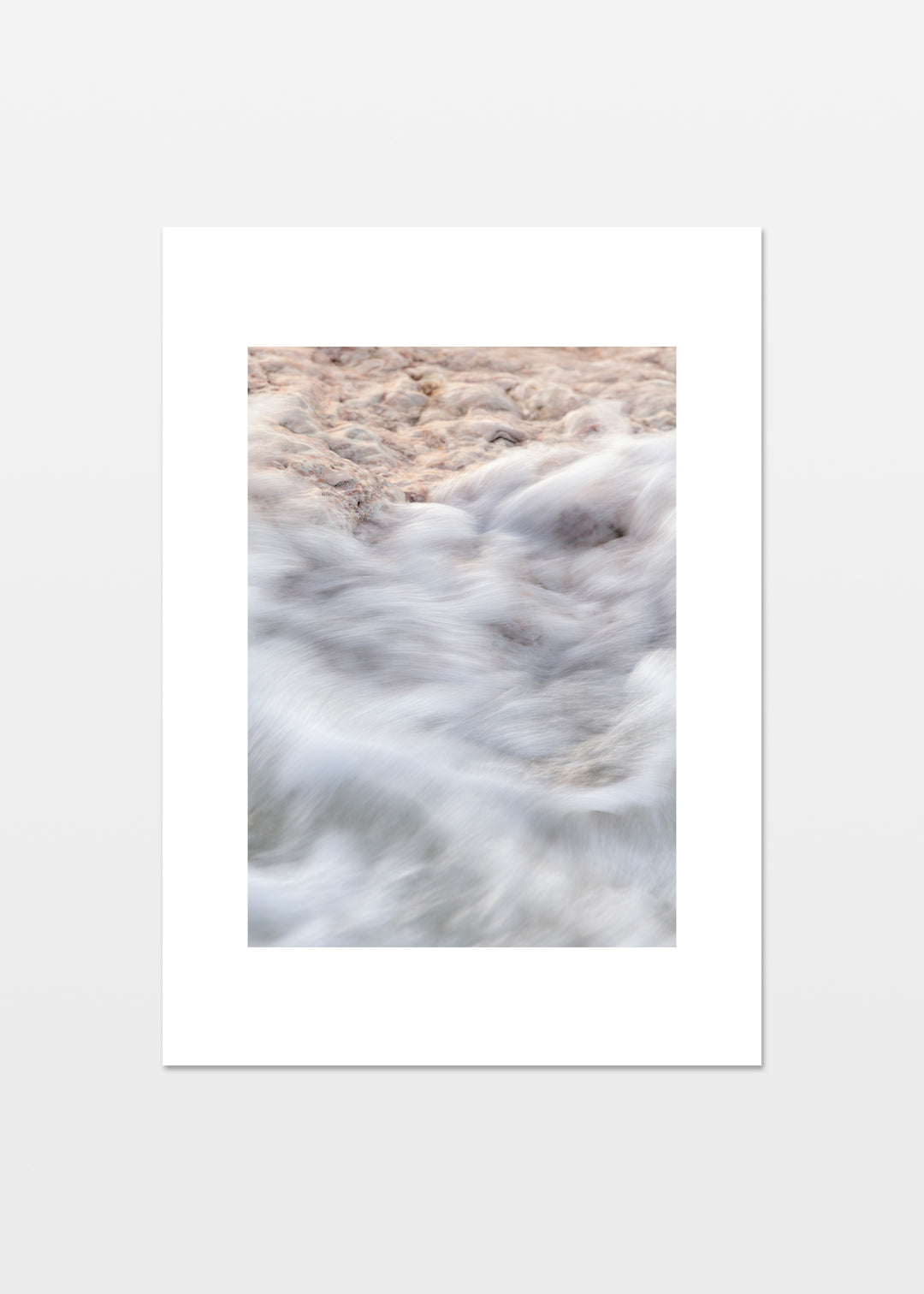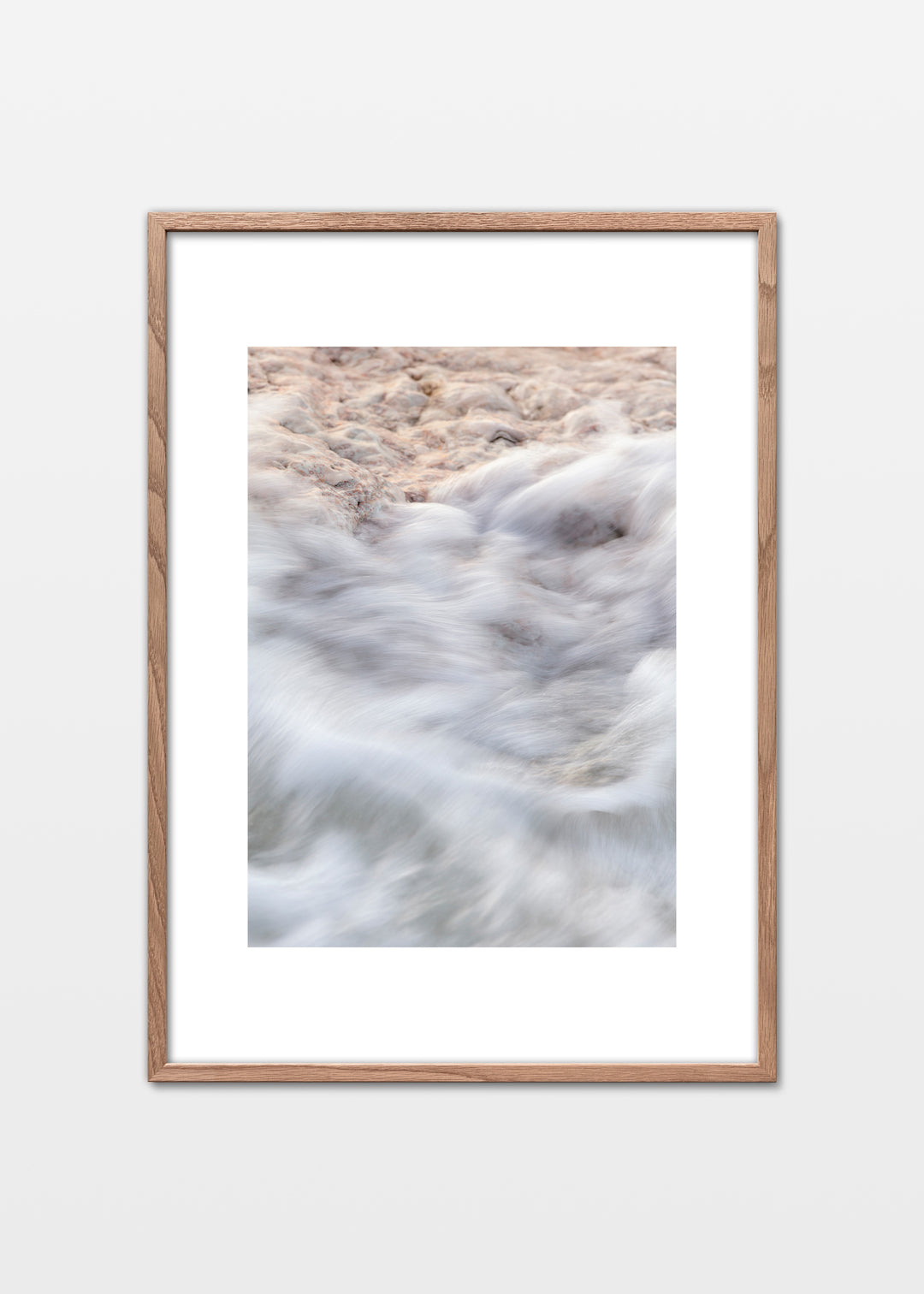En lys og minimalistisk plakat med et nærbillede af strandkanten på Gotland, hvor sten og vand mødes i et blødt spil af bevægelse. Vandets strøm tegner fine linjer omkring strandens overflade og skaber et fredfyldt udtryk.