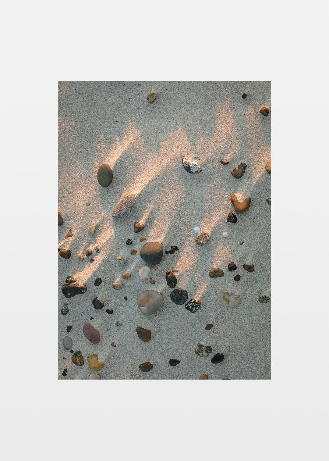 Strandsten plakat fra Skagen Nordstrand, taget en tidlig morgen efter endnu en fantastisk solopgang. På vej tilbage til bilen efter at have oplevet sælerne og det smukke morgenlys, går jeg langs stranden og betragter mønsteret i sandet under mine fødder. Det ene øjeblik er det blot sand, det næste øjeblik dukker stenene frem. I det varme morgenlys skabes en fascinerende kontrast mellem sandets bløde overflade og stenens hårde struktur, lige idet solens første stråler rammer stranden.