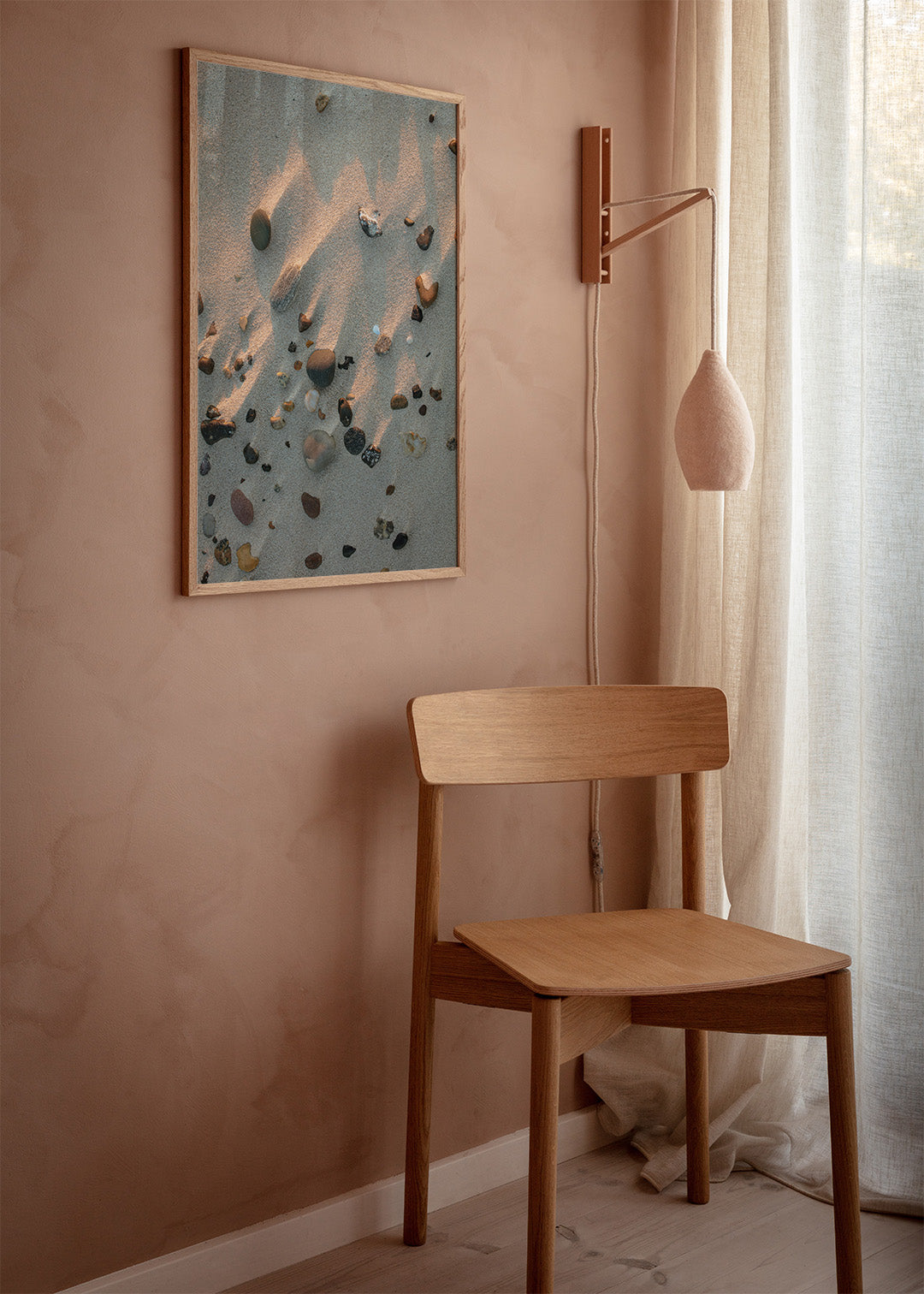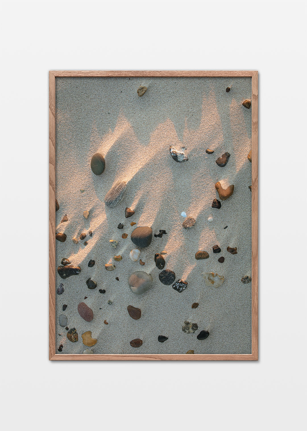 Dette motiv, hvor kameraet er rettet direkte ned i sandet, indfanger essensen af en tidlig morgentur på stranden. Med vores strandsten plakat kan du næsten mærke teksturen af sandet og stenene under dine fødder. Et lille udsnit af en stor strand, der symboliserer friheden og roen ved en tur til kysten. Det er en hyldest til de små detaljer i naturen, der ofte overses, men som rummer en helt særlig skønhed.