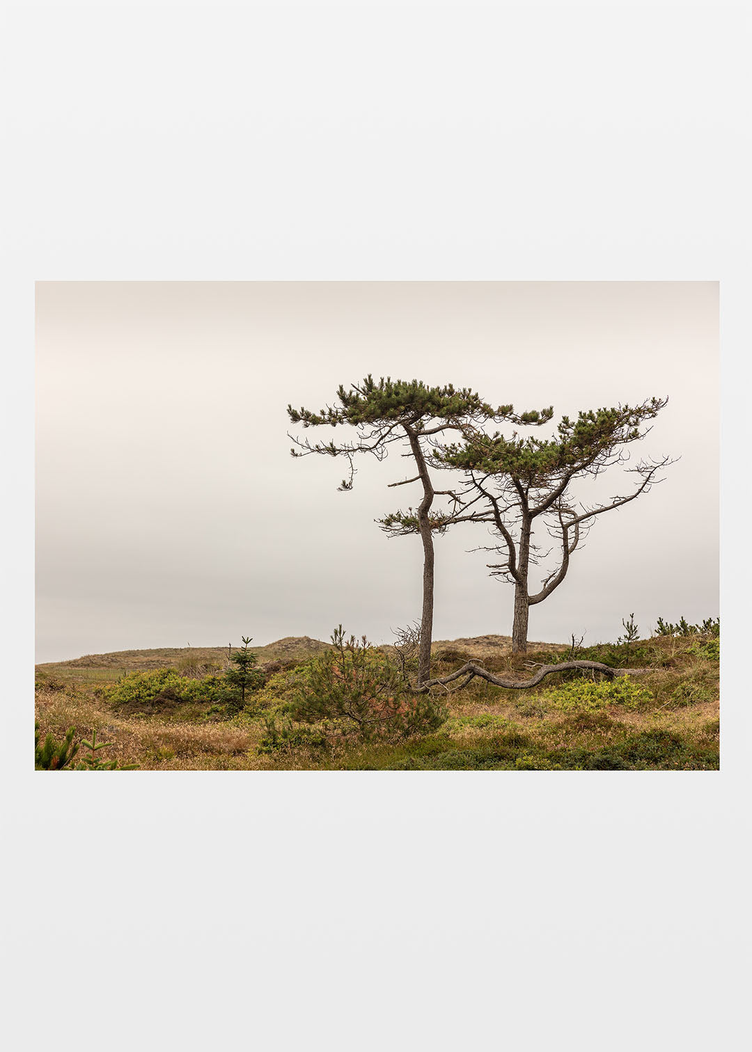 Denne plakat indfanger den enkle og rå skønhed i Nationalpark Thy med to træer, der står alene i det karakteristiske kystlandskab. Træernes skulpturelle former mod den grå himmel skaber en rolig og minimalistisk komposition, der indrammer essensen af den danske vestkyst. Det åbne landskab og de blide farver fremhæver stedets tidløse charme og naturlige harmoni.