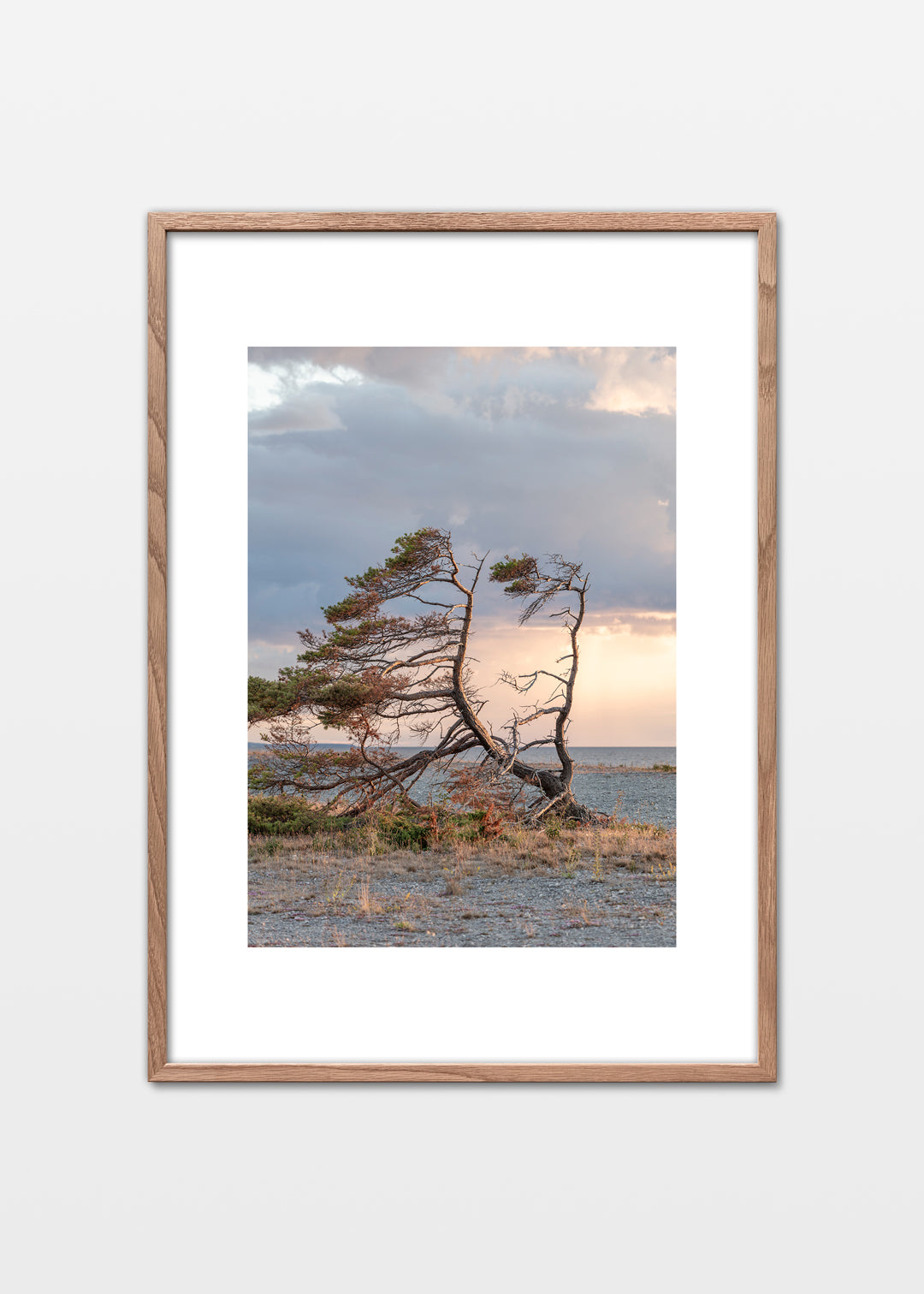 Ved Digerhuvud på Fårö står dette vindblæste fyrtræ, formet af årtiers vejr og vind langs Gotlands kyst. Træets skulpturelle silhuet mod horisonten skaber et dramatisk og stemningsfuldt motiv.