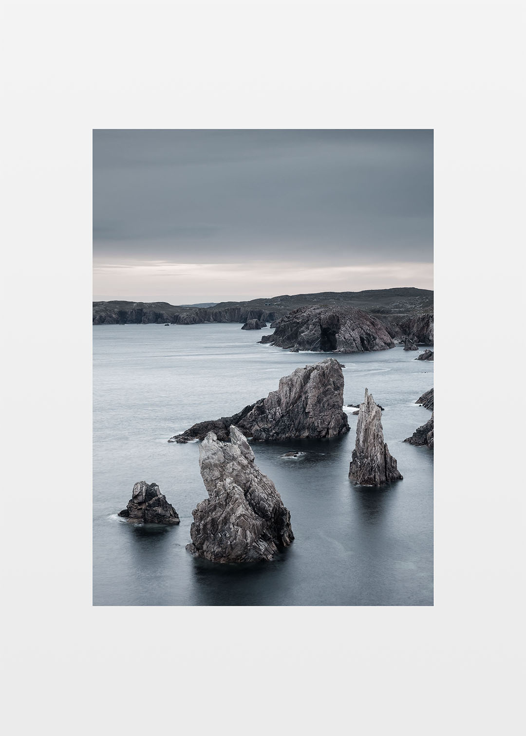 Ydre Hebrider plakat af de dramatiske Mangursta Needles i Skotland. Solen er gået ned, og bugten er indhyllet i et smukt blåt lys, hvor aften og nat mødes. Mangursta ligger fjernt fra civilisationen, og denne majestætiske klippekyst besøges kun af få. Det barske landskab og det hårde klima fik beboerne i det nærliggende samfund til at forlade området for mange år siden. Plakaten indfanger den rå og uberørte skønhed ved denne afsidesliggende kyststrækning, hvor naturens kræfter hersker. Plakaten er printet på høj kvalitets papir med en professionel fotoprinter, hvilket sikrer, at alle detaljer og nuancer i landskabet bliver levende gengivet. Dette gør plakaten ideel for dem, der ønsker at bringe et stykke af Skotlands vilde og dramatiske kystnatur ind i deres hjem.